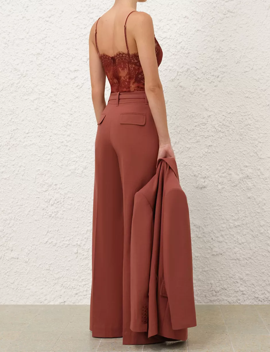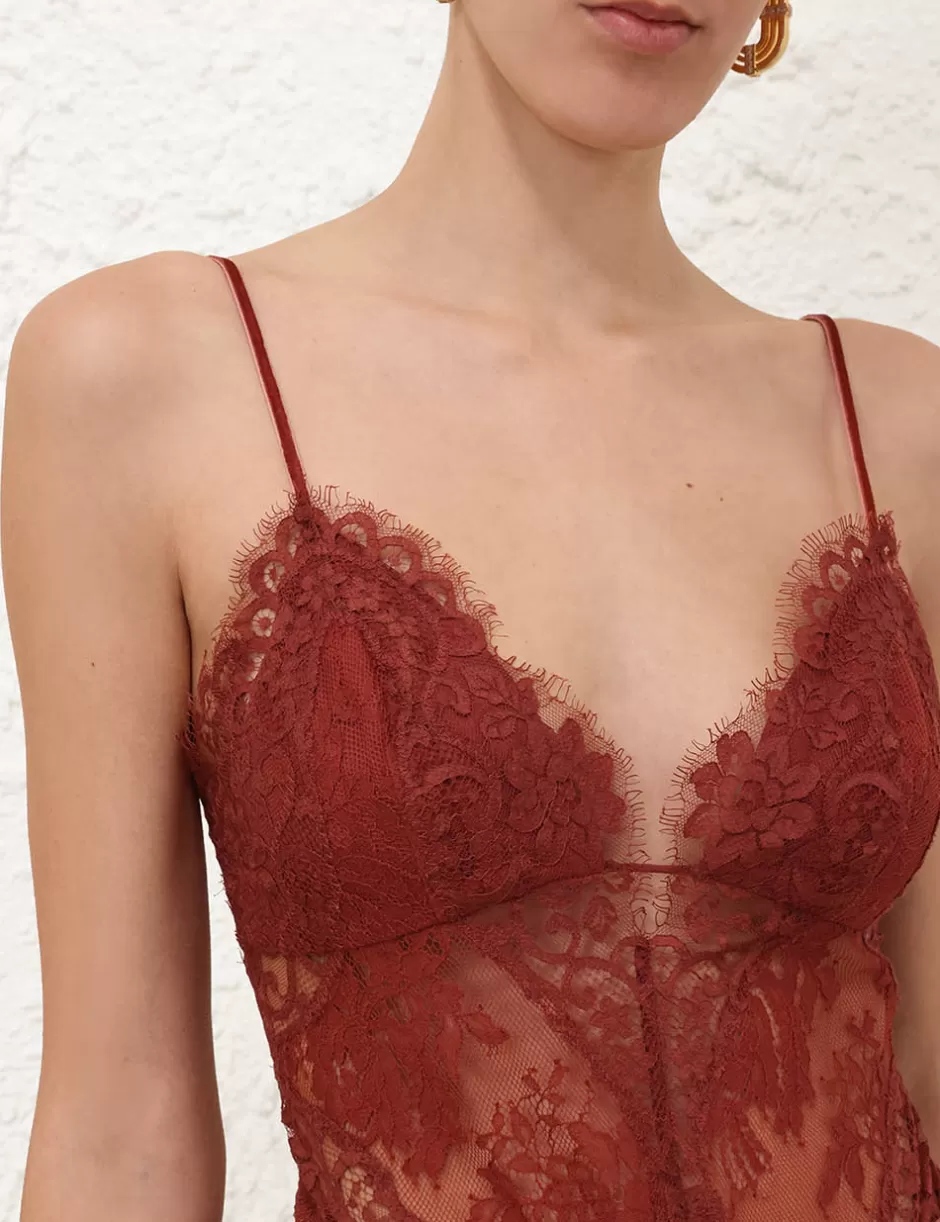 The Illustration Lace Teddy in Chestnut from our Fall 2024 Collection, In Illustration. A lace bodysuit featuring an invisible centre back zip closure and adjustable straps.