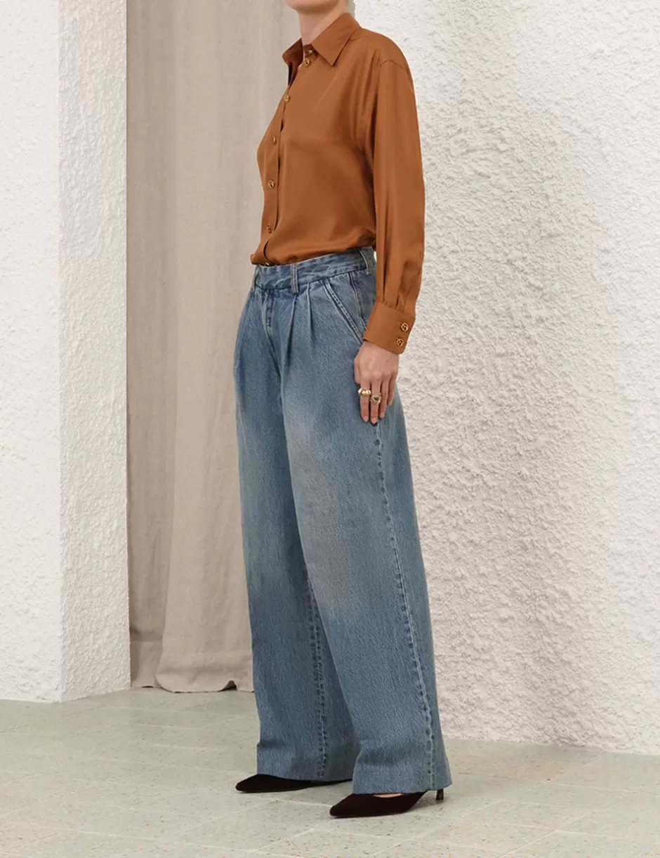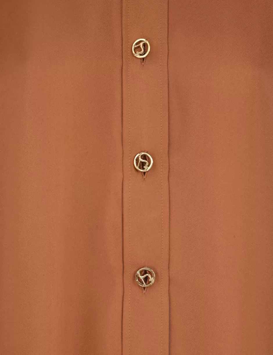 The Illustration Relaxed Shirt in Cognac from our Fall 2024 Collection, In Illustration. A silk shirt featuring buttons down the centre front, gathered cuffs and a classic collar.