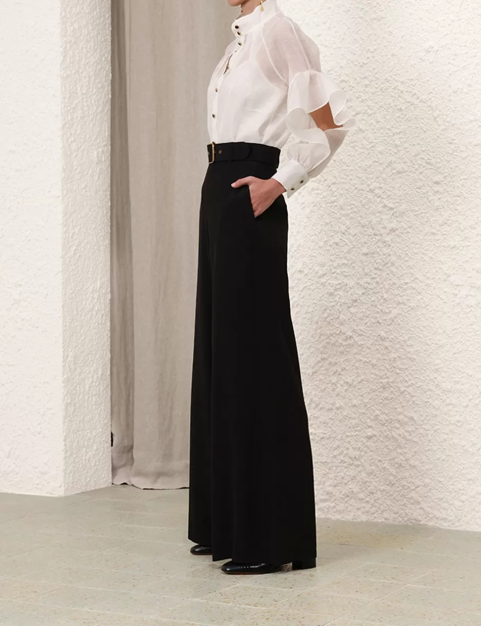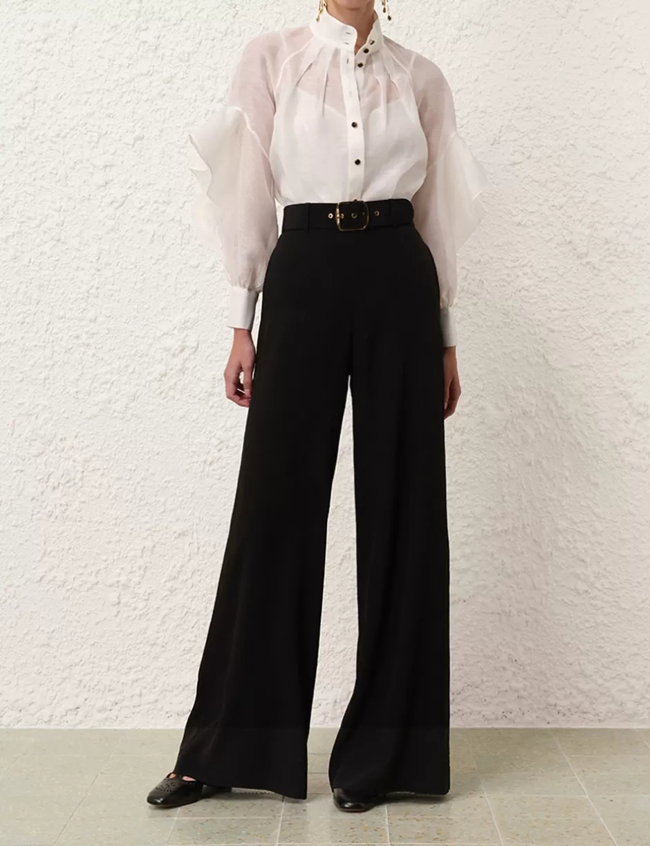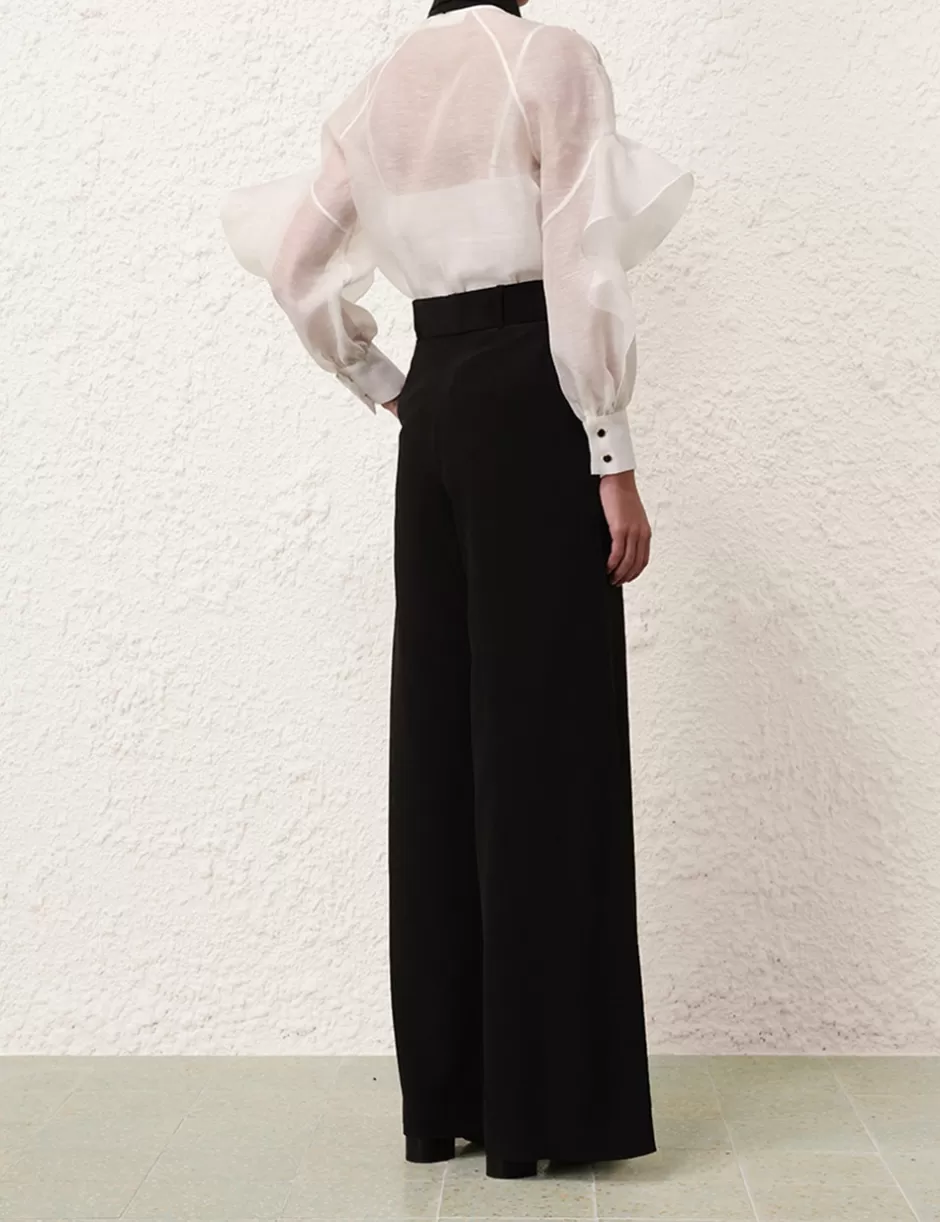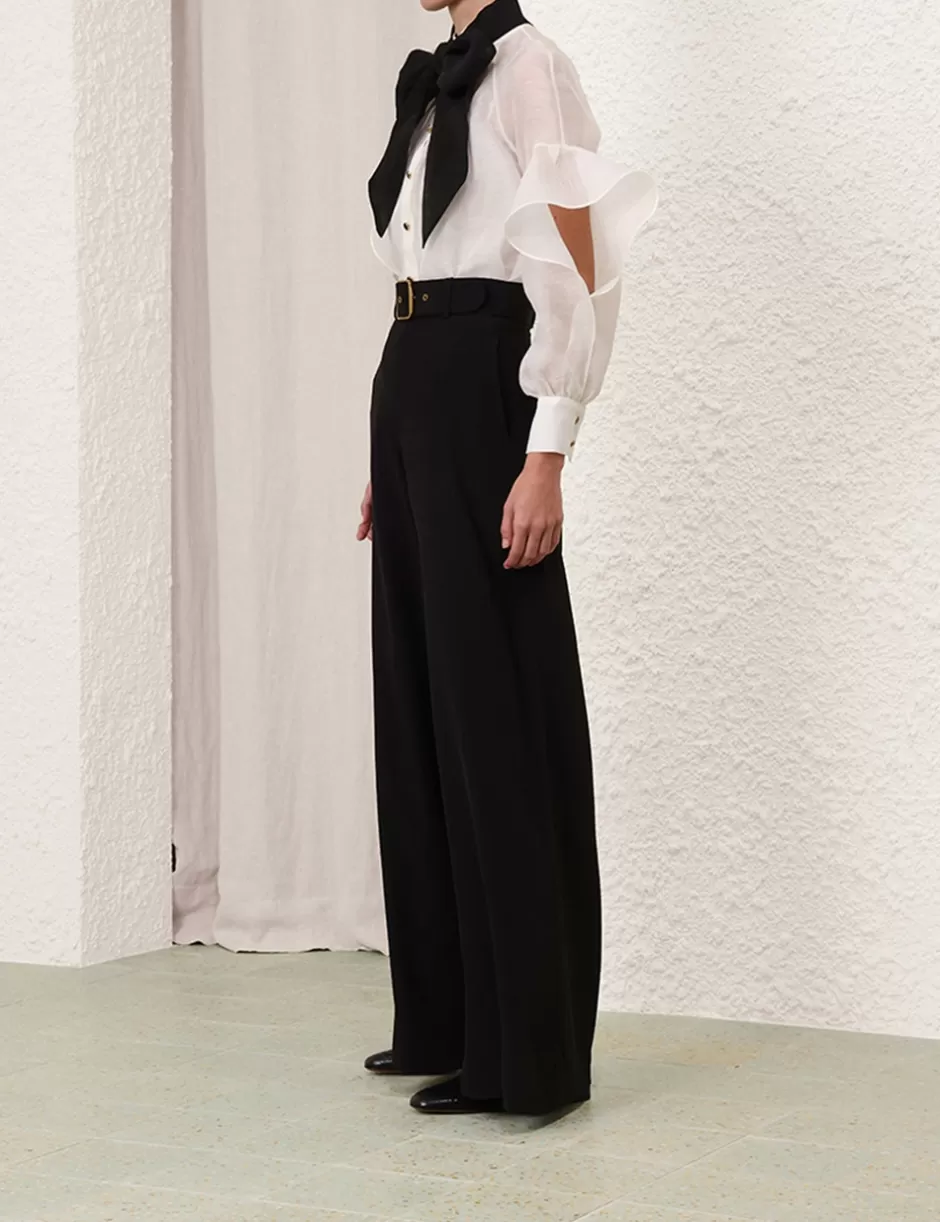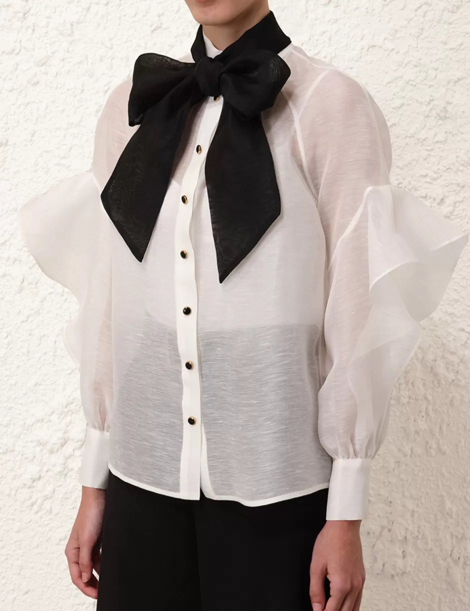 The Illustration Waterfall Shirt in Ivory from our Fall 2024 Collection, In Illustration. A silk linen organza shirt featuring a detachable contrast neck tie, buttons down the centre front and long frilled sleeves with side splits.