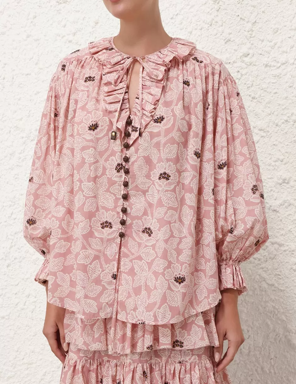 The Ottie Ruffle Neck Top in Dusty Rose Floral from our Summer Swim 2024 Collection. A cotton long sleeve top featuring a ruffled neckline and buttons down the centre front.