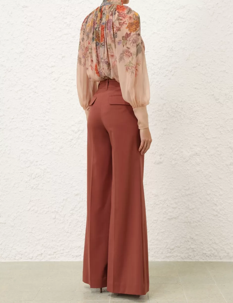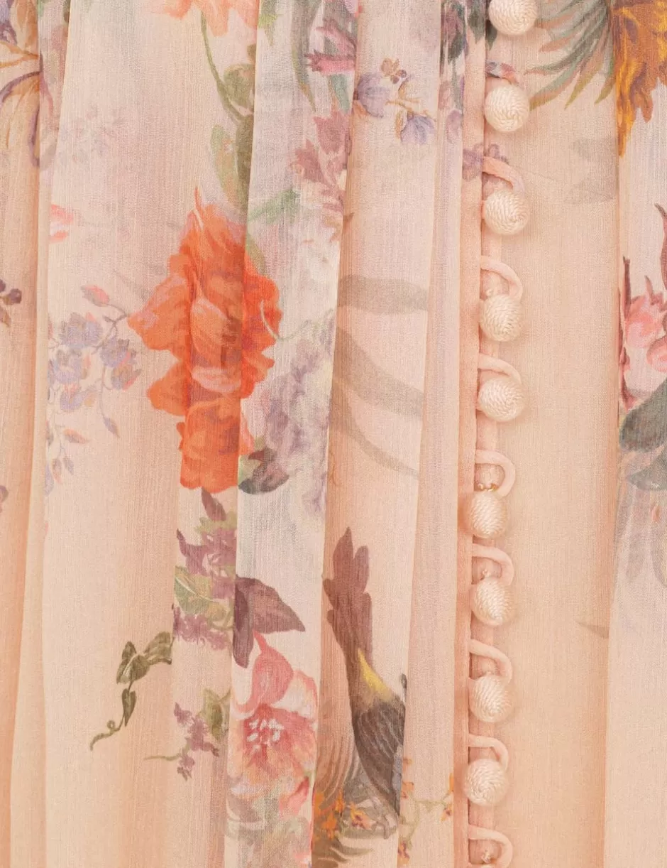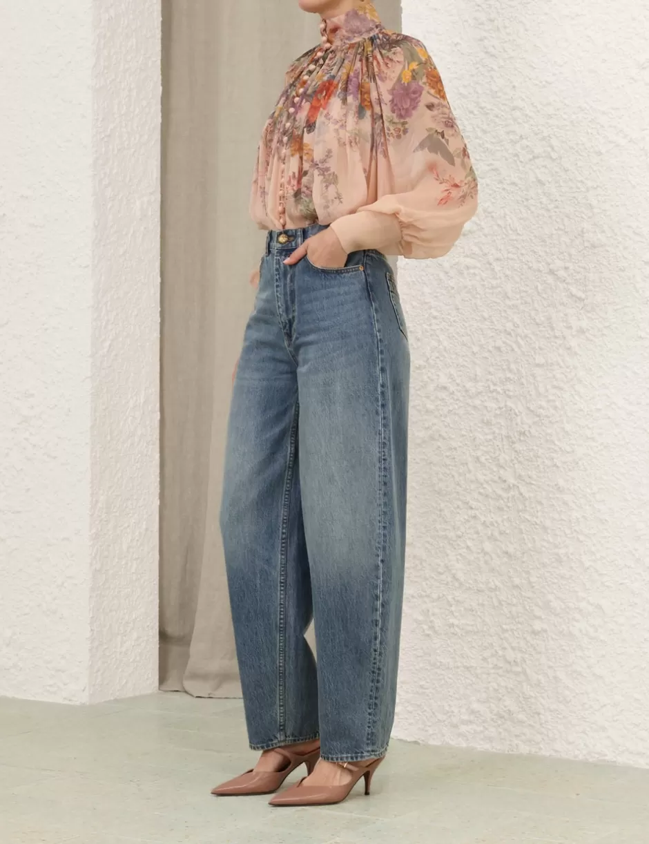 The Pavilion Smock Blouse in Peach Multi Floral from our Fall 2024 Collection, In Illustration. A relaxed fit blouse featuring a high collar neckline, elongated blouson sleeves and heavy gathering throughout.