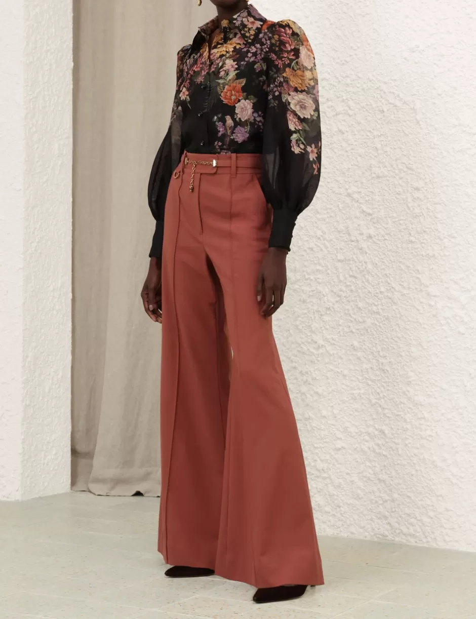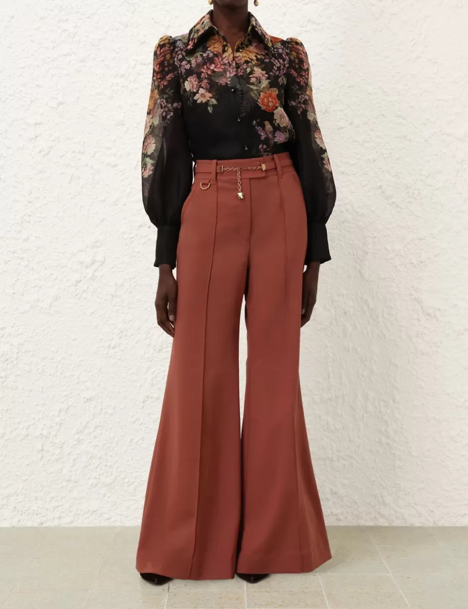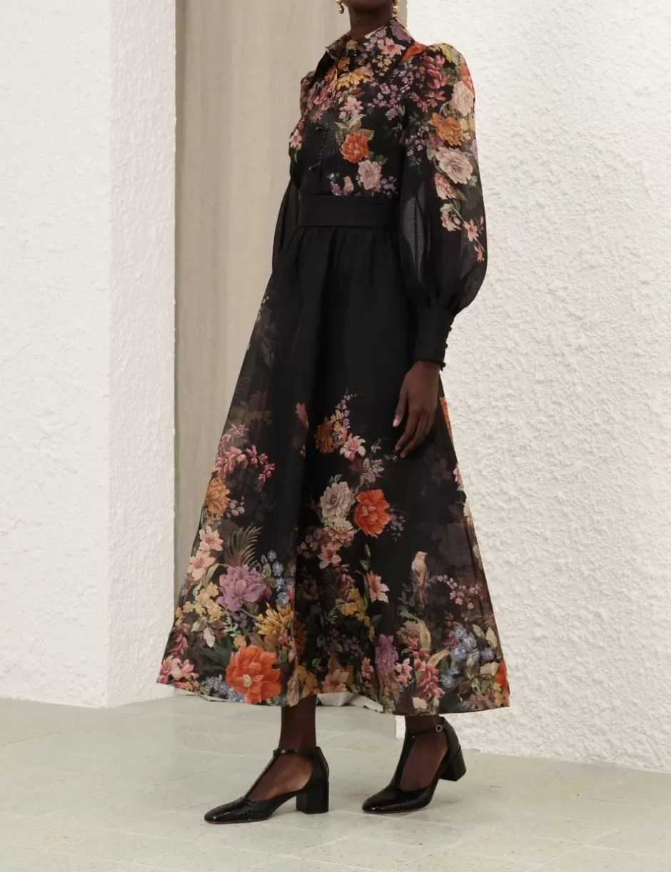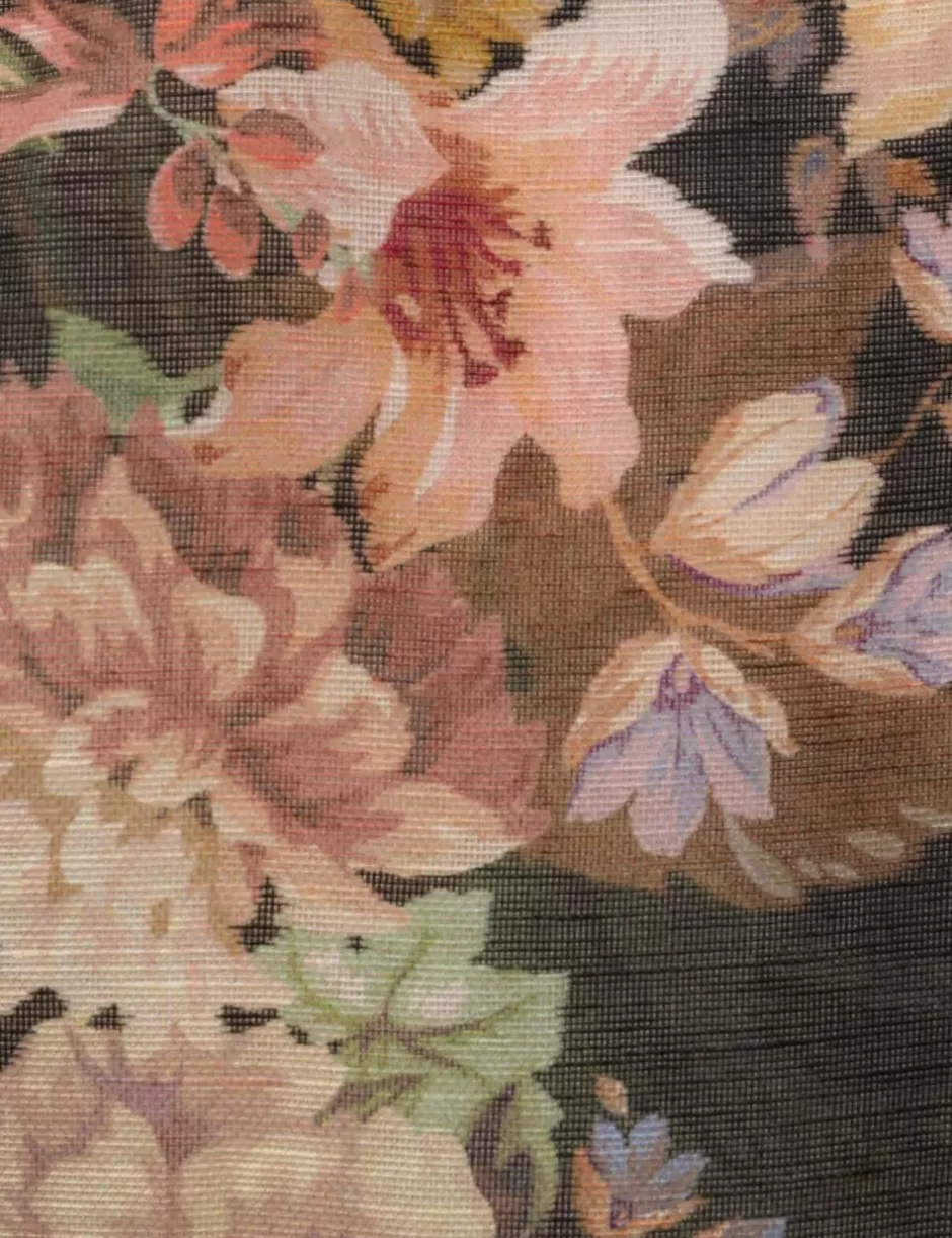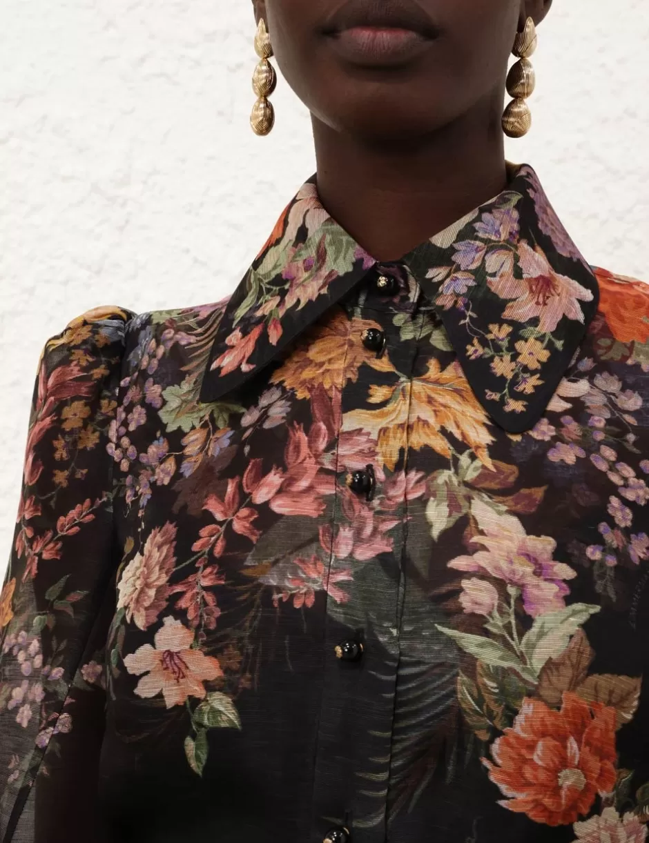 The Pavilion Tie Neck Blouse in Black Multi Floral from our Fall 2024 Collection, In Illustration. A silk linen shirt featuring long blouson sleeves, buttons down the centre front and gathered cuffs.