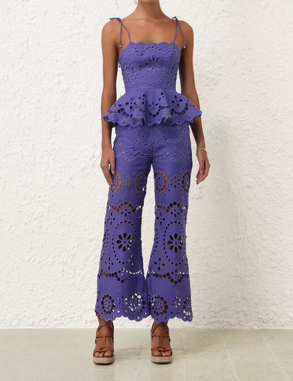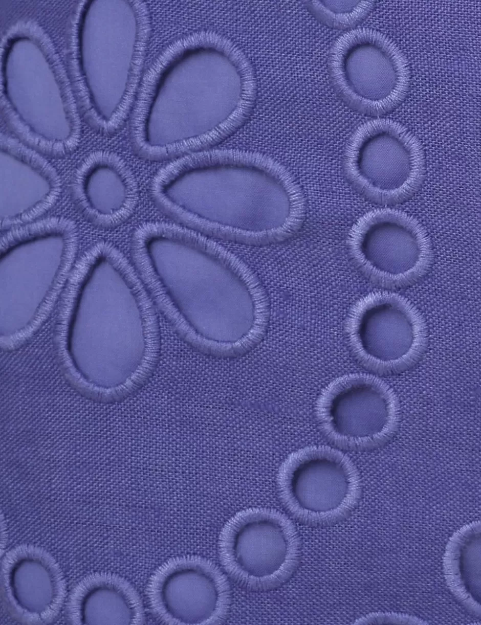 The Pop Embroidered Scallop Top in Blue from our Summer Swim 2024 Collection. A linen top featuring scallop embroidery along the top edge and peplum hems, finished with a back zip closure.