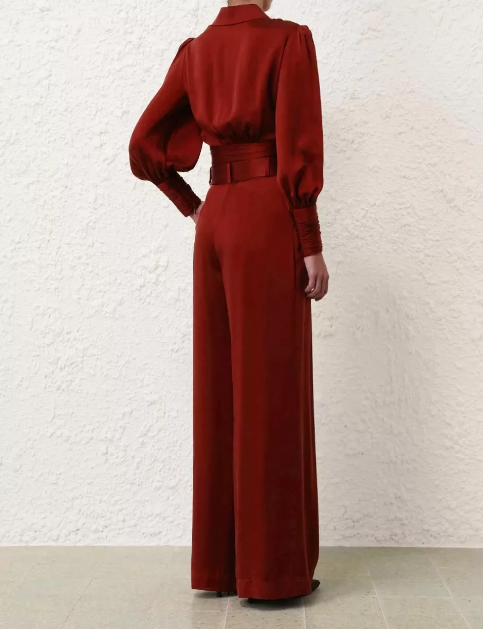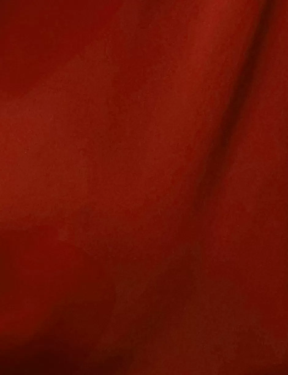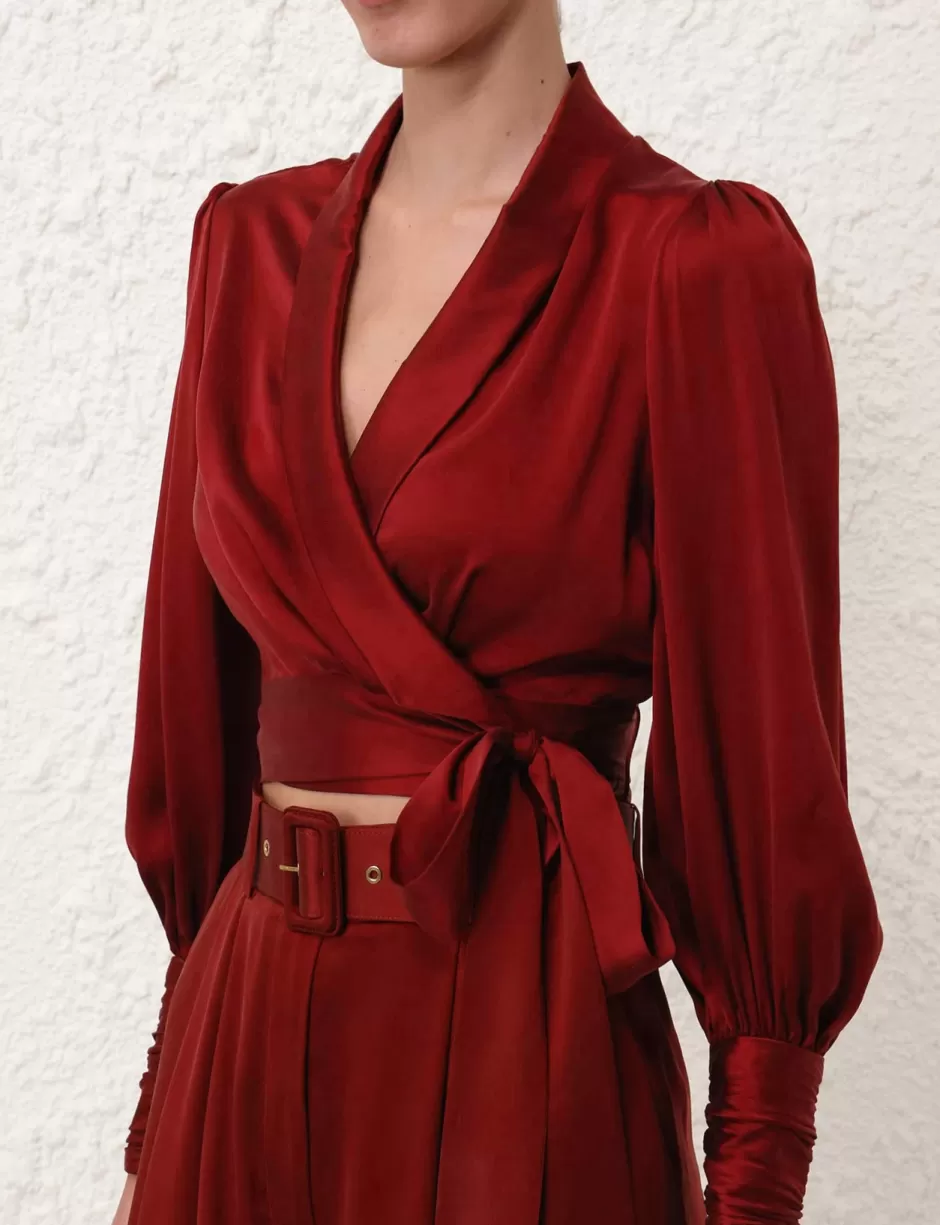The Silk Wrap Top in Burgundy from our Fall 2024 Collection, In Illustration. A silk top featuring a wrap front silhouette, blouson sleeves and plunging V-neckline.