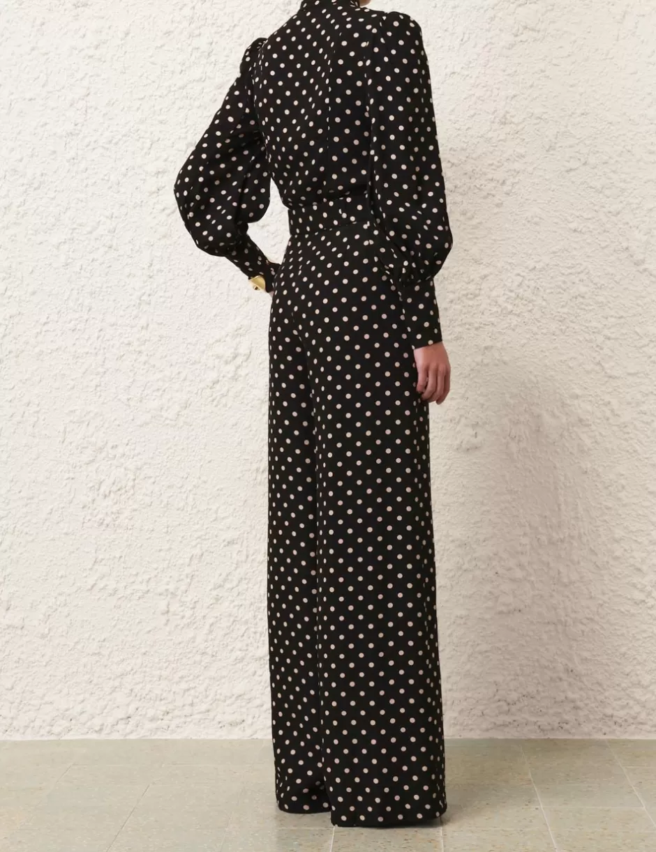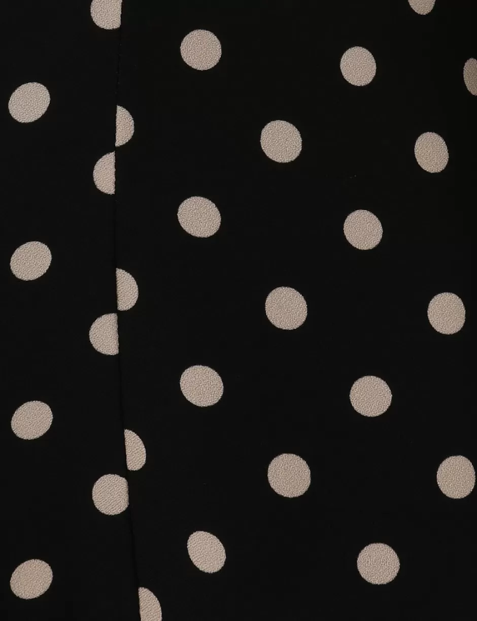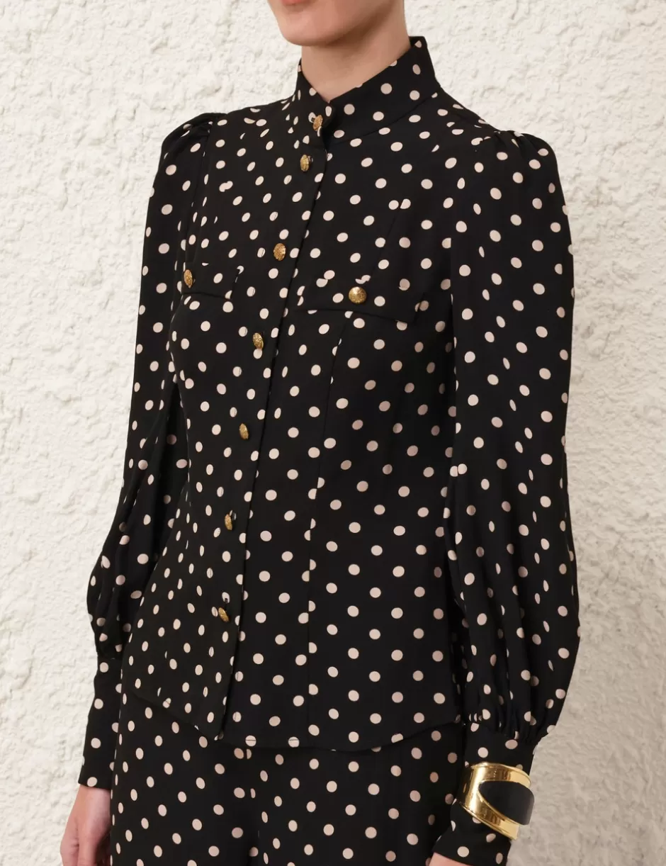 The Utility Blouse in Black/Cream Dot from our Fall 2024 Collection, In Illustration. A long sleeve blouse featuring blouson sleeves, centre front buttons with rouleau button loops.