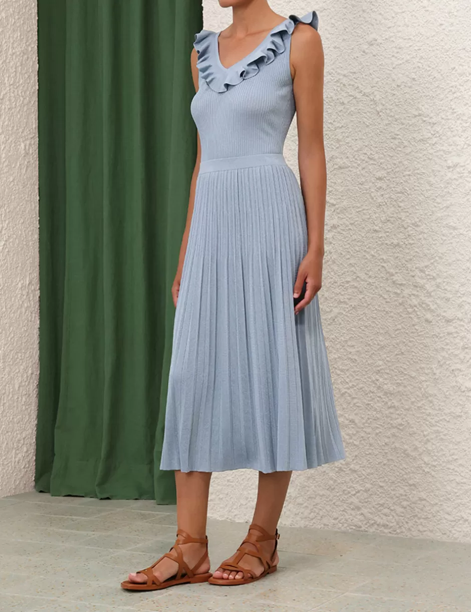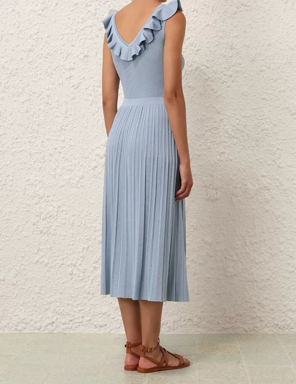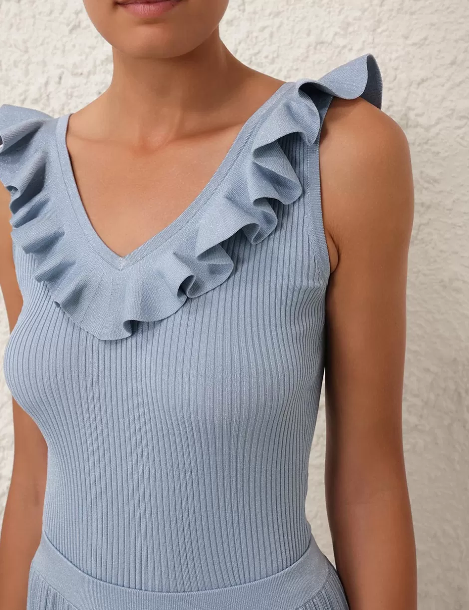 The Waverly Frill V-Neck Top in Blue Lurex from our Summer Swim 2024 Collection. A ribbed knit, fitted tank with a frilled v-neckline.