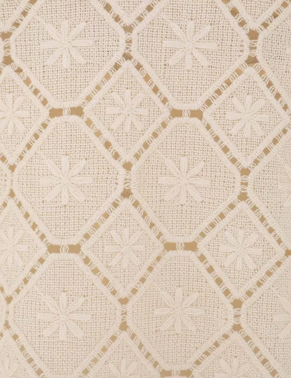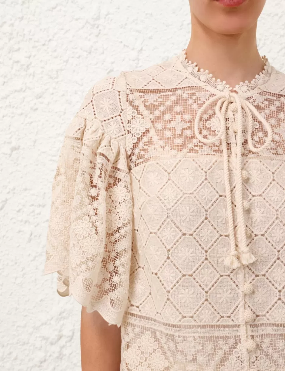 The Wylie Crochet Blouse in Tea from our Resort Swim 2025 Collection. A crochet blouse featuring a rounded neckline with a self tie neck tie, crochet buttons down the centre front and scallop trim at the neckline, sleeve hems, and body hem.