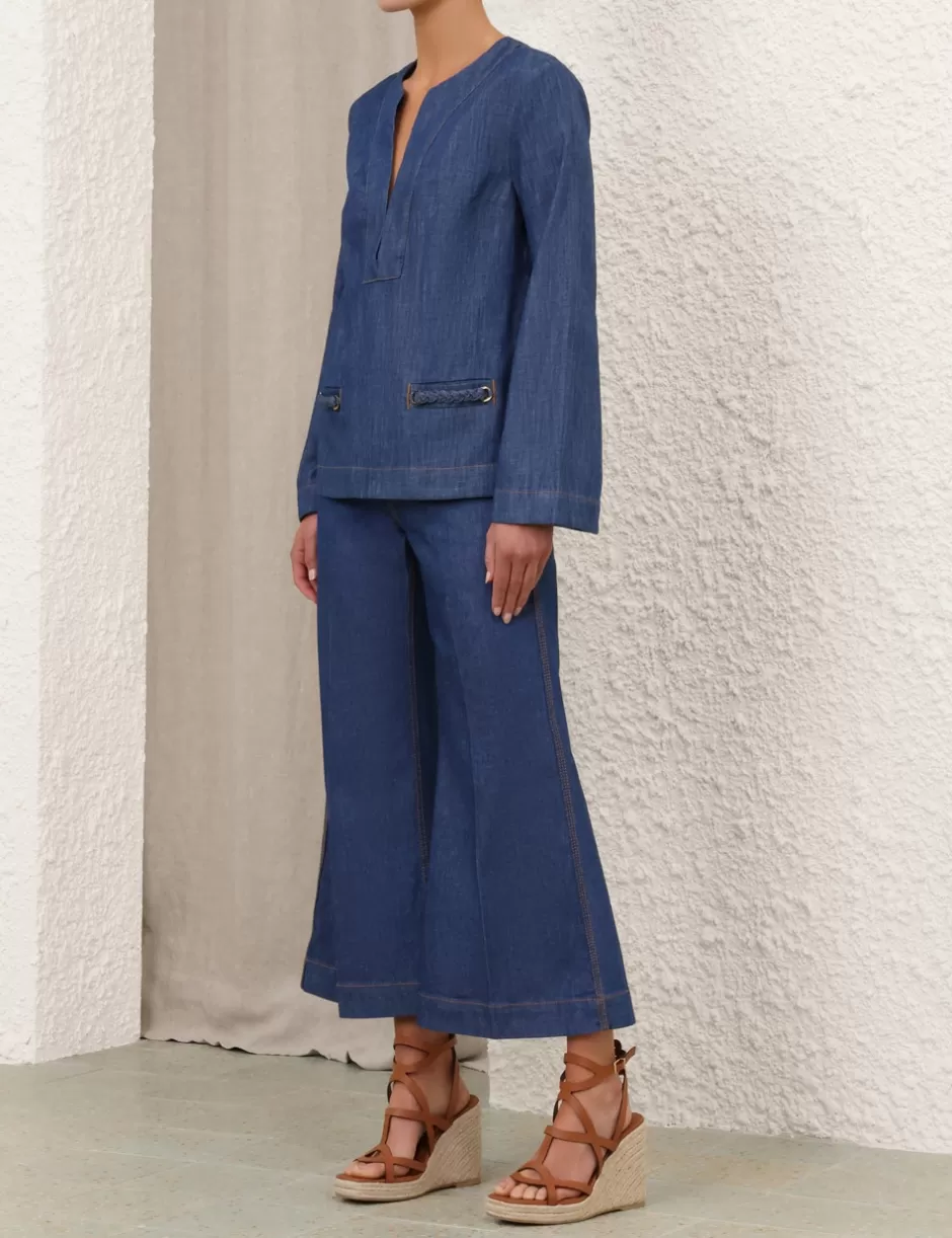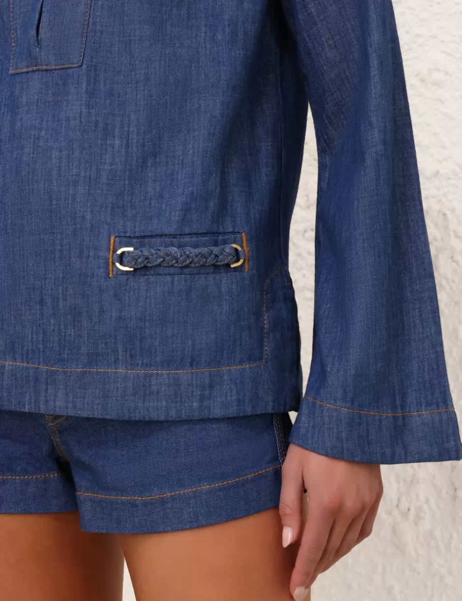 The Wylie Denim Tunic Top in Railway Blue from our Resort Swim 2025 Collection. A denim tunic top featuring wide sleeves, yoke detail down the centre front and front pockets.