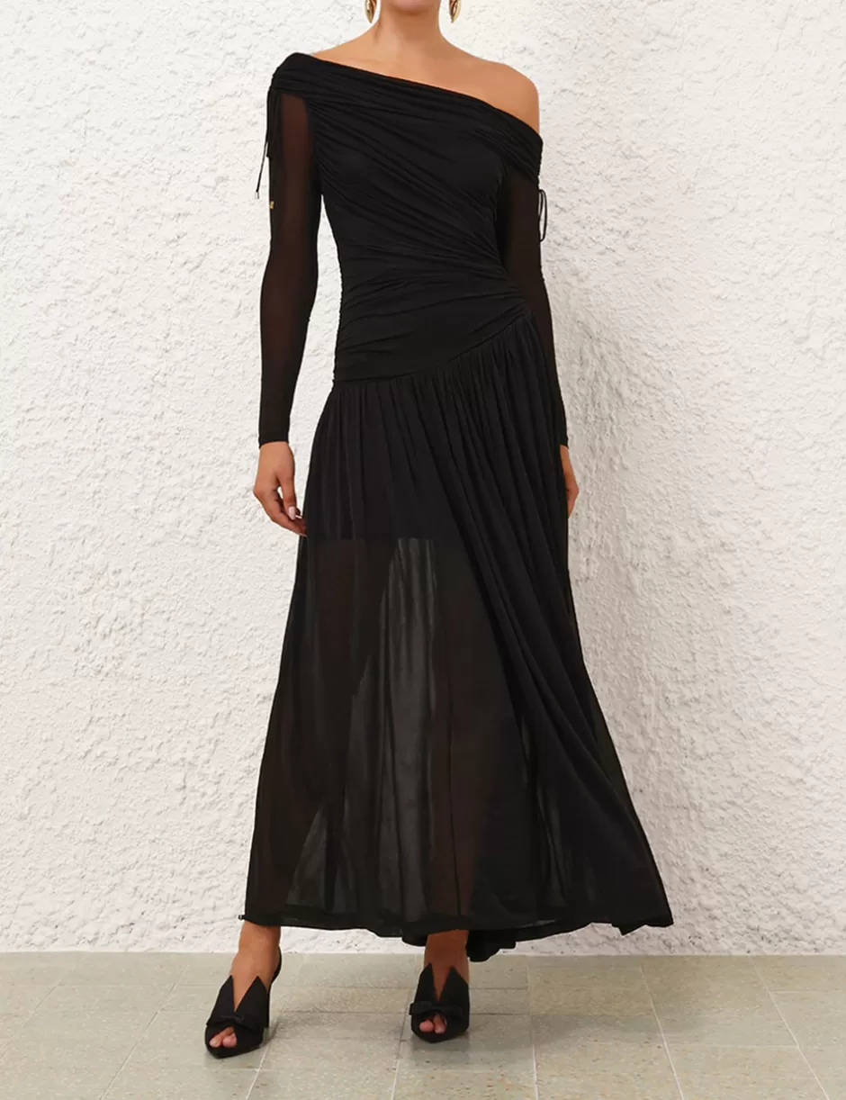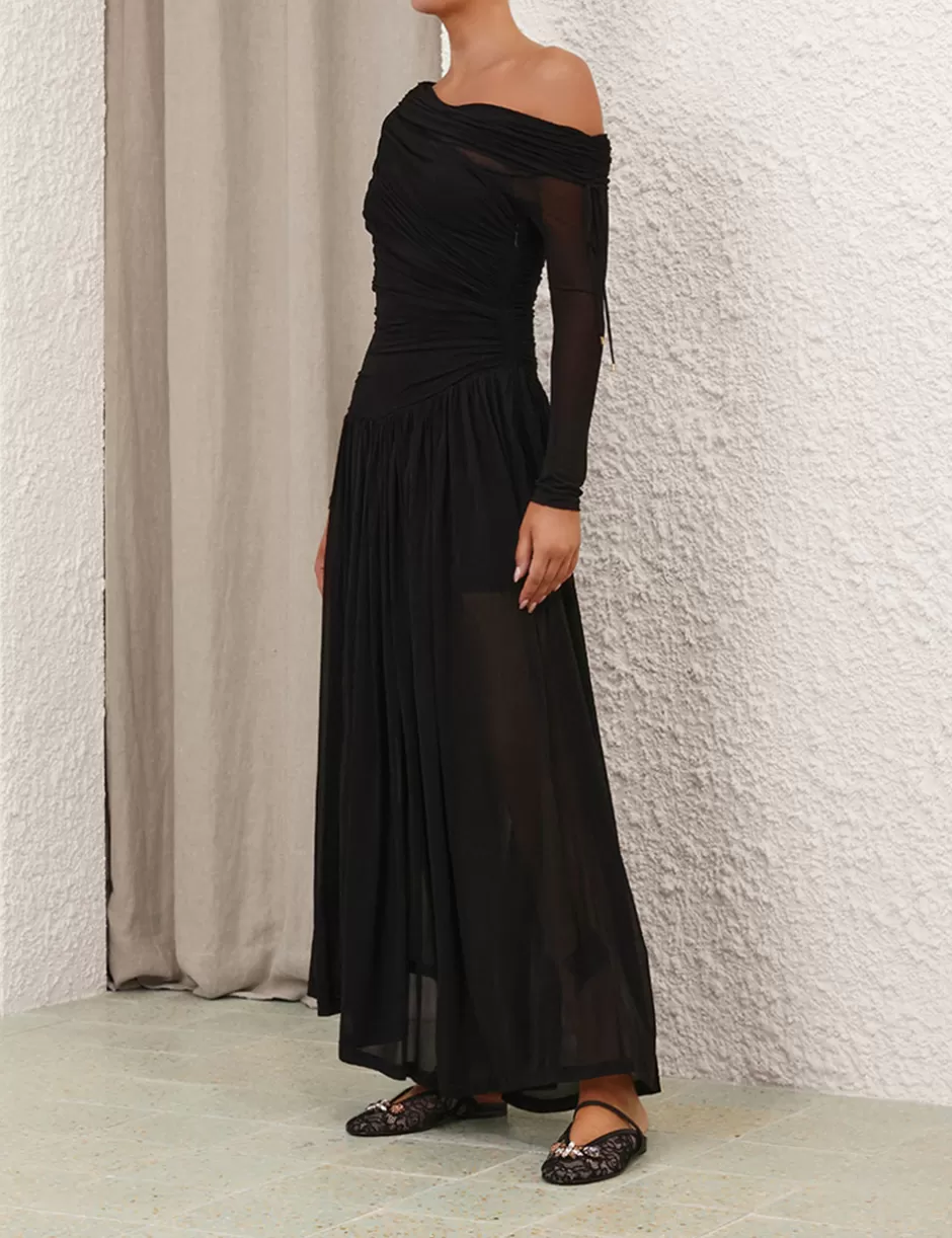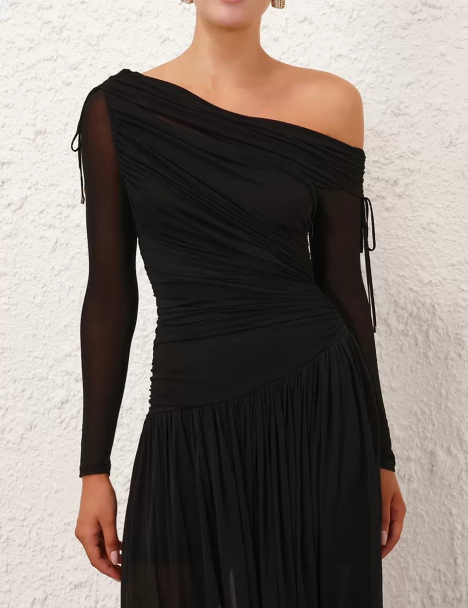 The Crush Asymmetrical Midi Dress in Black from our Resort 2025 Collection, Crush. A midi dress featuring anoff-shoulder asymmetric silhouette, a heavily gathered bodice, and ruching on both sides of the shoulders with gold toggles on the sleeves.