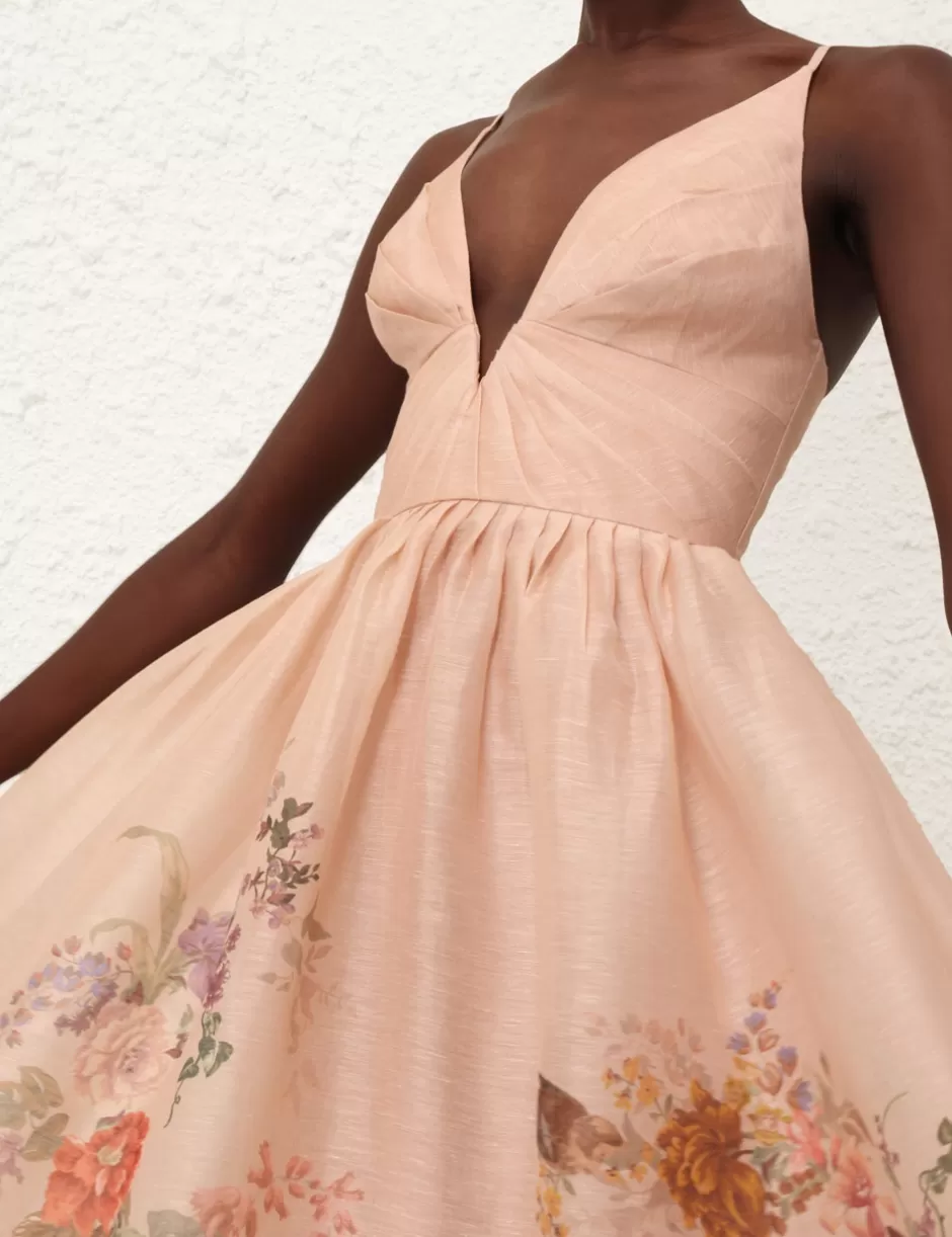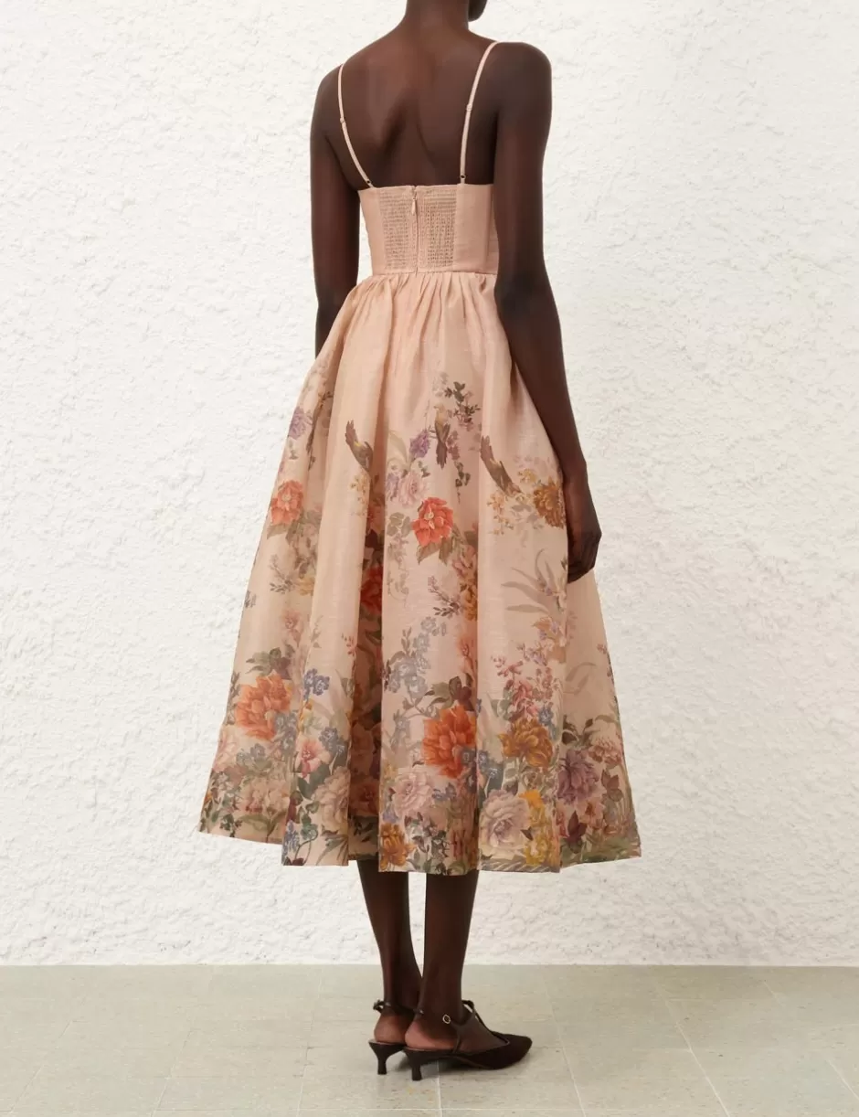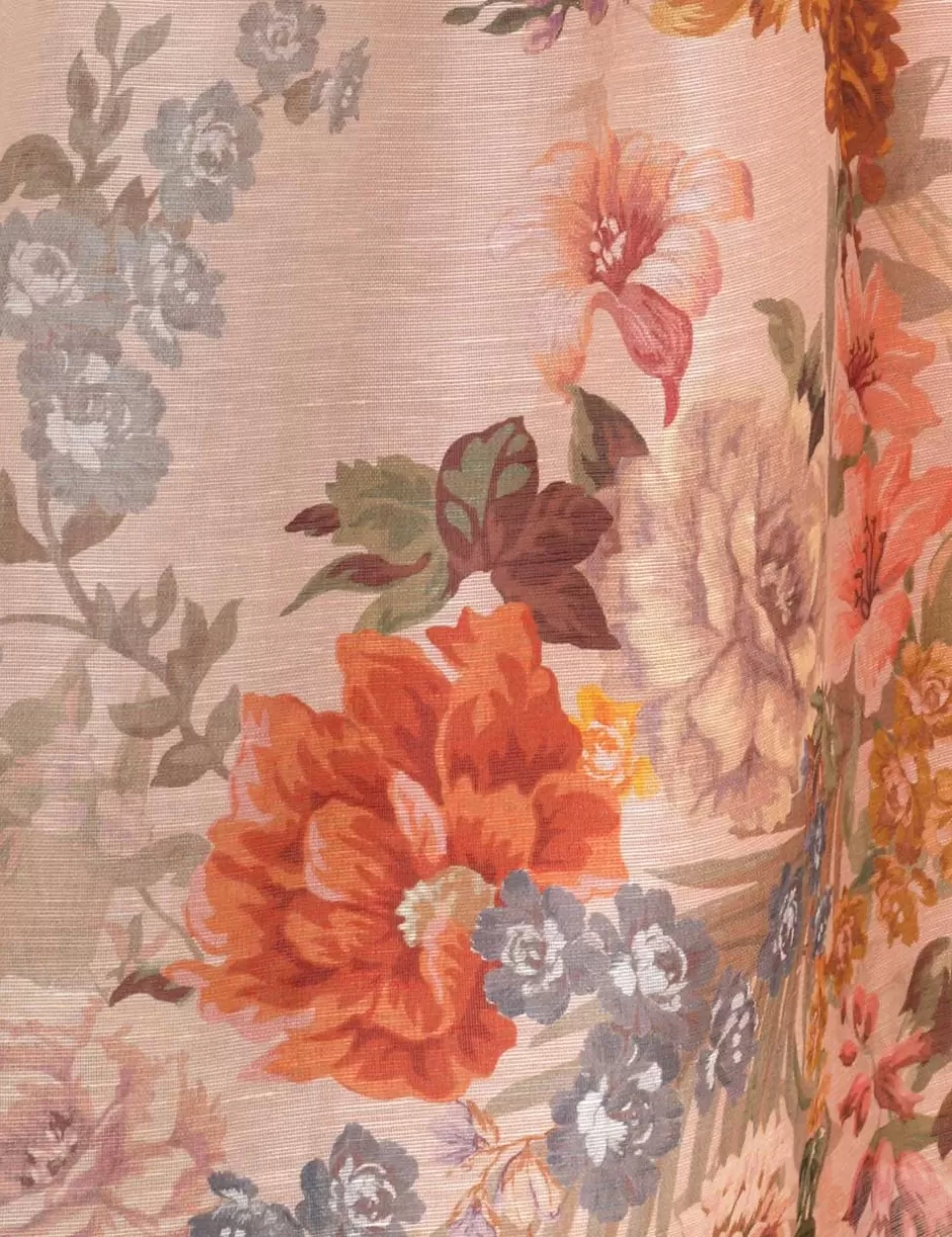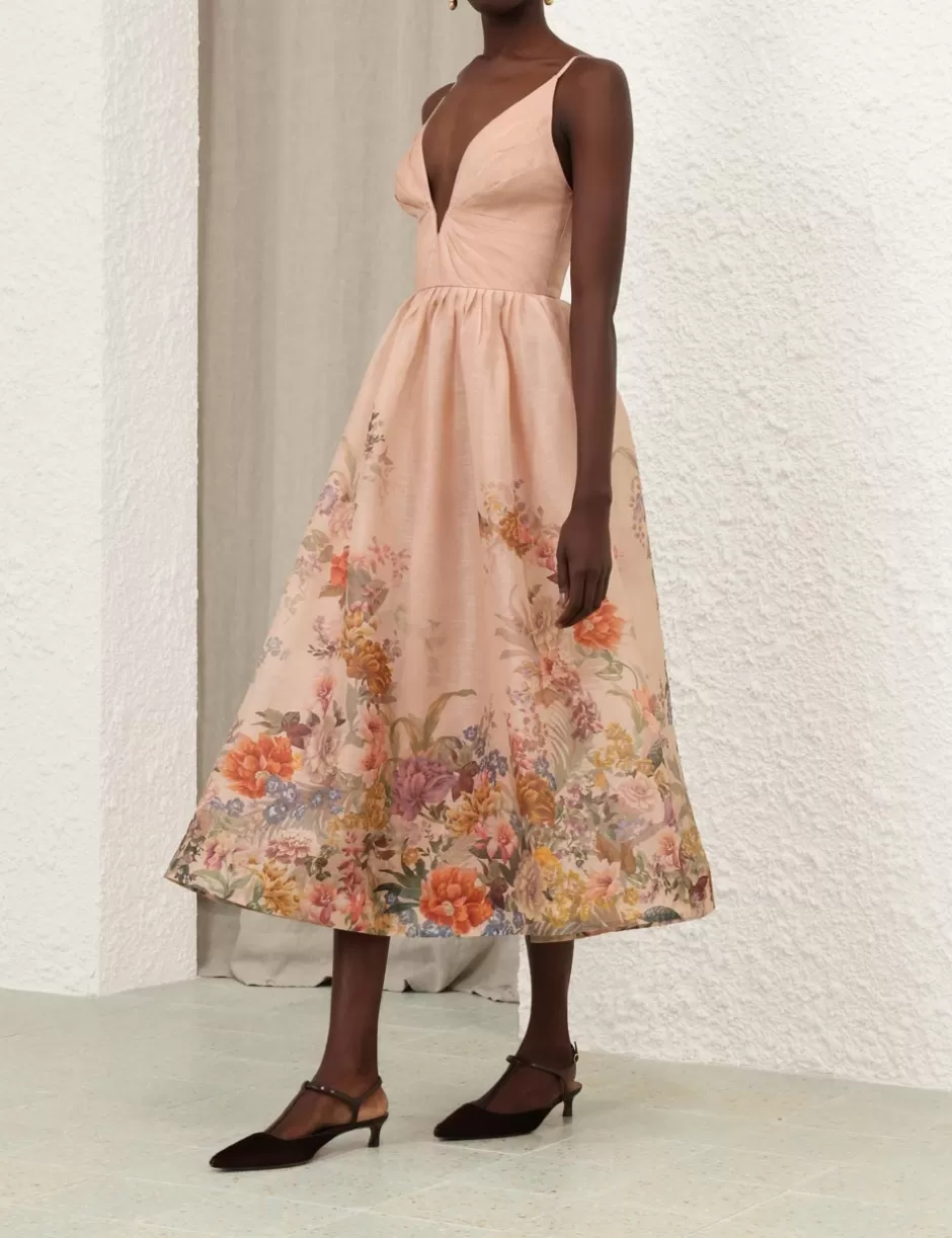 The Pavilion V Neck Midi Dress in Peach Multi Floral from our Fall 2024 Collection, In Illustration. A silk linen midi dress featuring a fitted bodice, a plunging V-neckline and a gathered waist skirt.