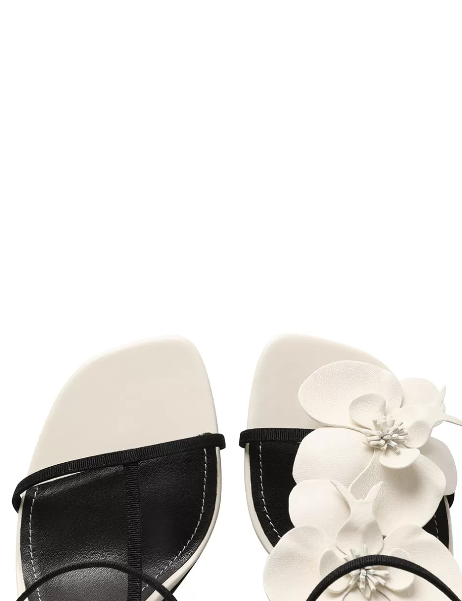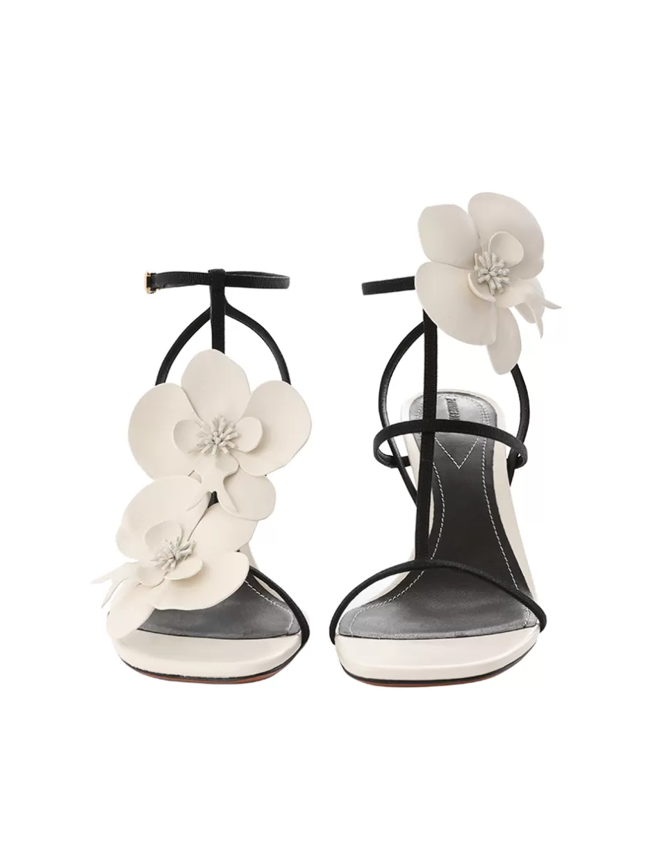 The Zimmermann Orchid Sandal 85 in Macadamia from our Spring 2024 Collection, Natura. A heeled sandal featuring a statement orchid flower design and contrast leather straps.