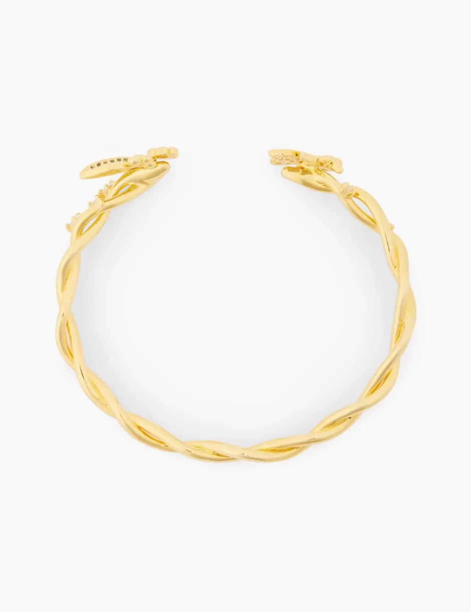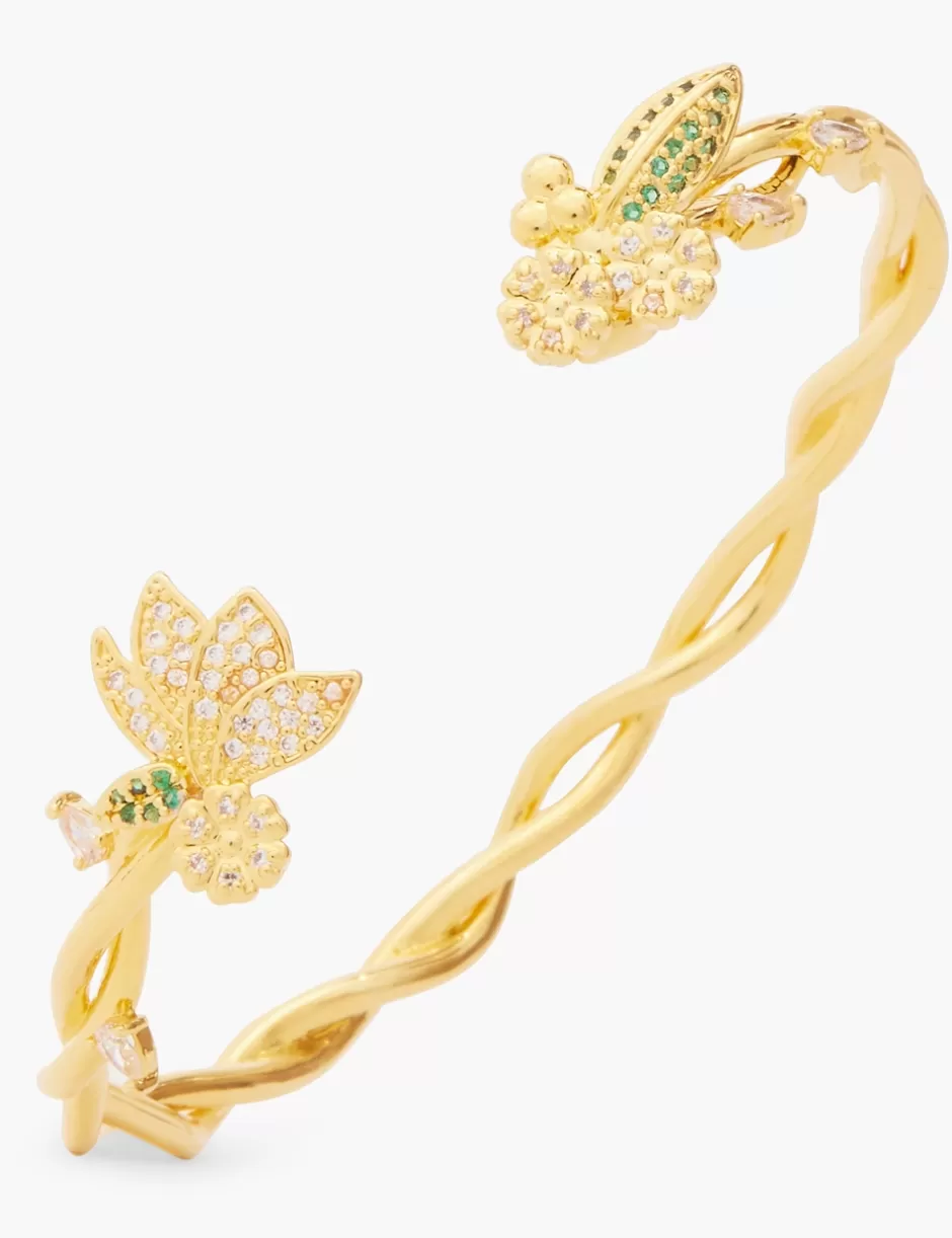 The Zimmermann Bloom Cuff in Gold/Green from our Spring 2024 Collection, Natura. A gold plated chain wrist cuff featuring green and white cubic zirconia stones and a twist look detail.