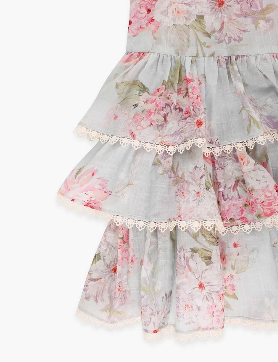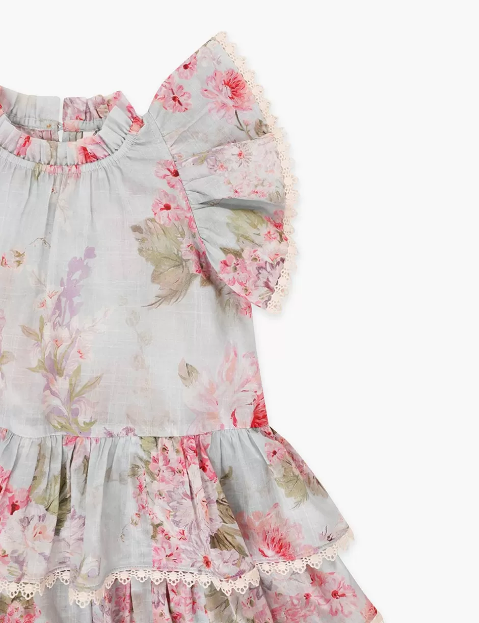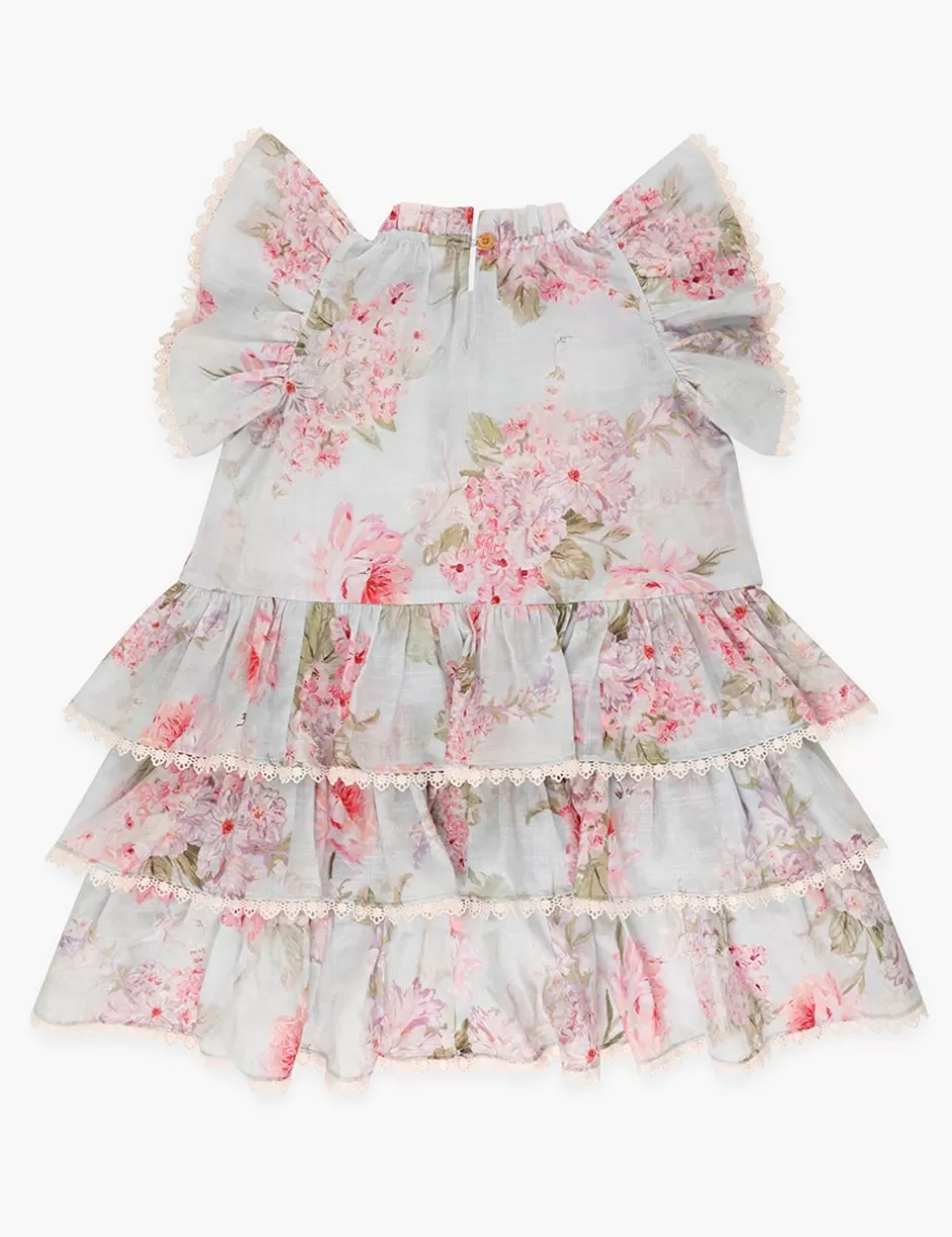 The Halliday Frill Swing Dress in Blue Watercolour Floral from our Summer Swim 2024 Collection. A cotton kids dress featuring frills throughout.