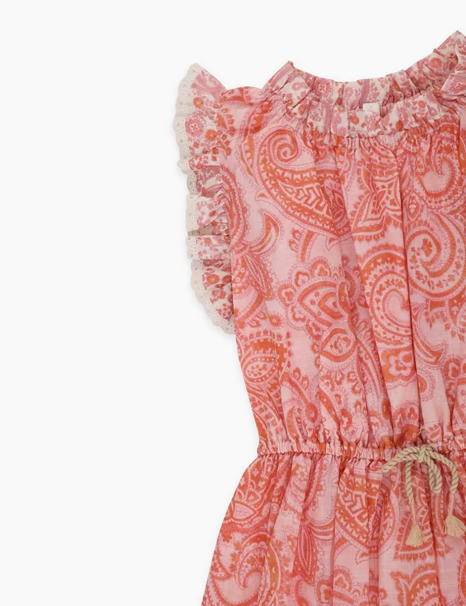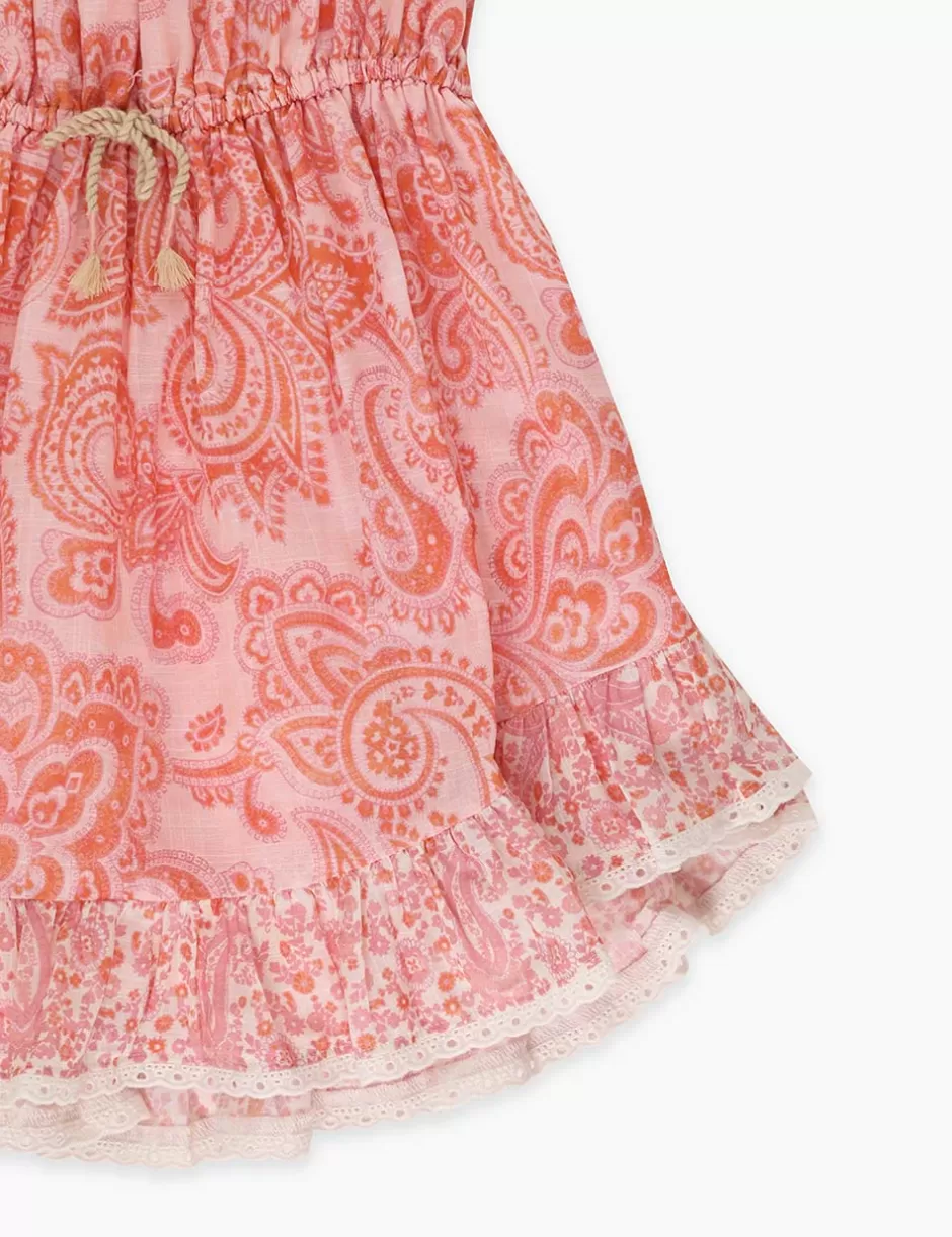 The Ottie Flip Dress in Pink Paisley from our Summer Swim 2024 Collection. A cotton flip dress featuring a playful flip hem with gathered frill neckline and sleeves.