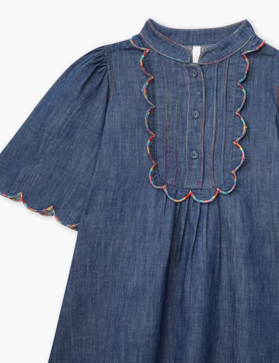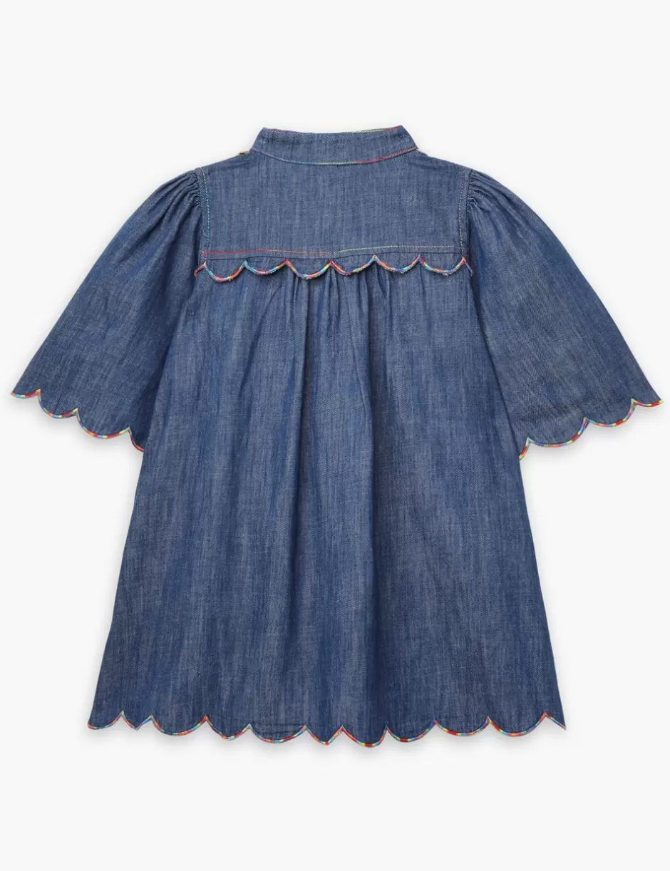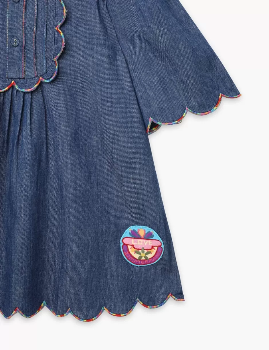 The Ottie Scallop Denim Dress in Blue Lagoon from our Summer Swim 2024 Collection. A kids denim dress featuring a scallop trim edge and a mandarin collar.