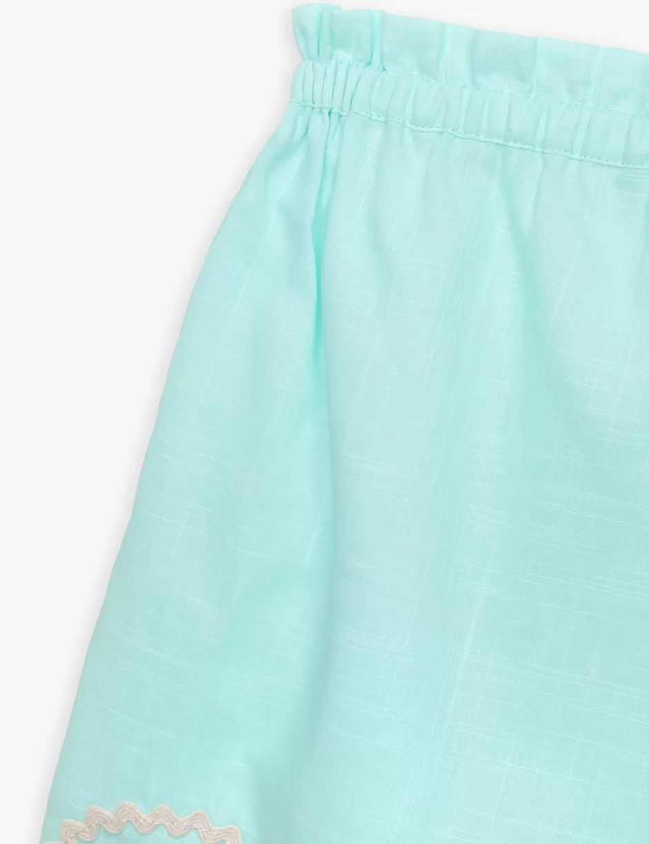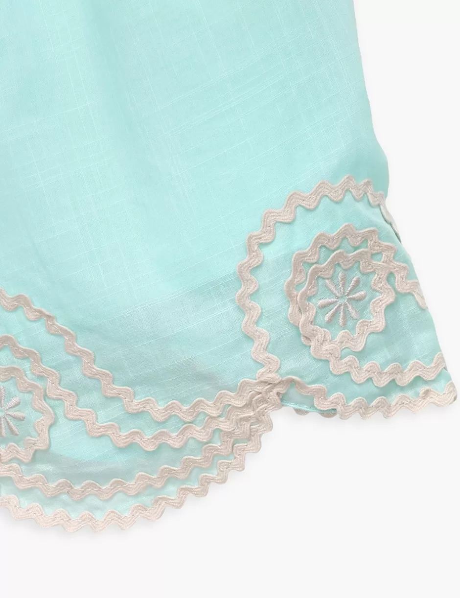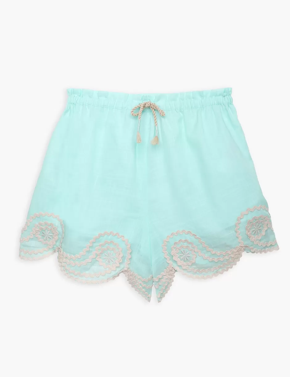 The Waverly Ric Rac Short in Blue from our Summer Swim 2024 Collection. A cotton short featuring an elasticated waistband and scallop trim hem.