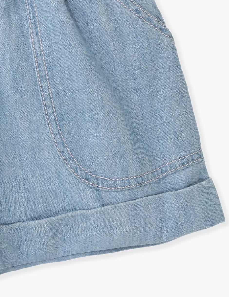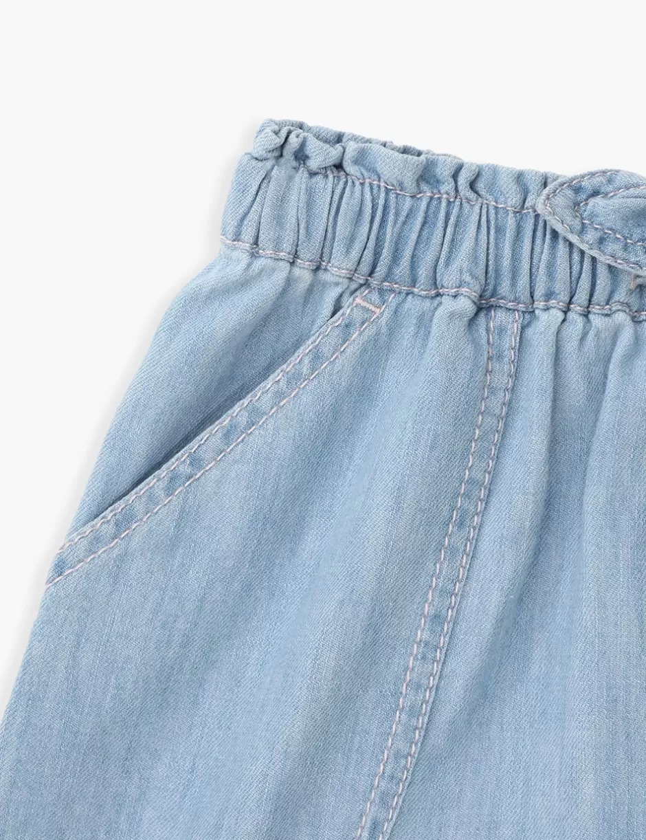 The Waverly Utility Denim Short in Blueberry from our Summer Swim 2024 Collection. A denim short with an elasticated waistband, fixed waist tie and patch pockets.