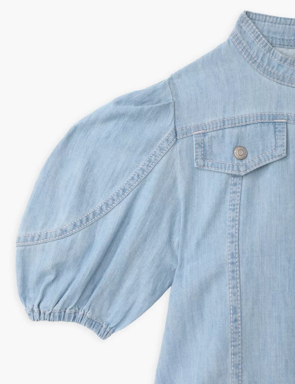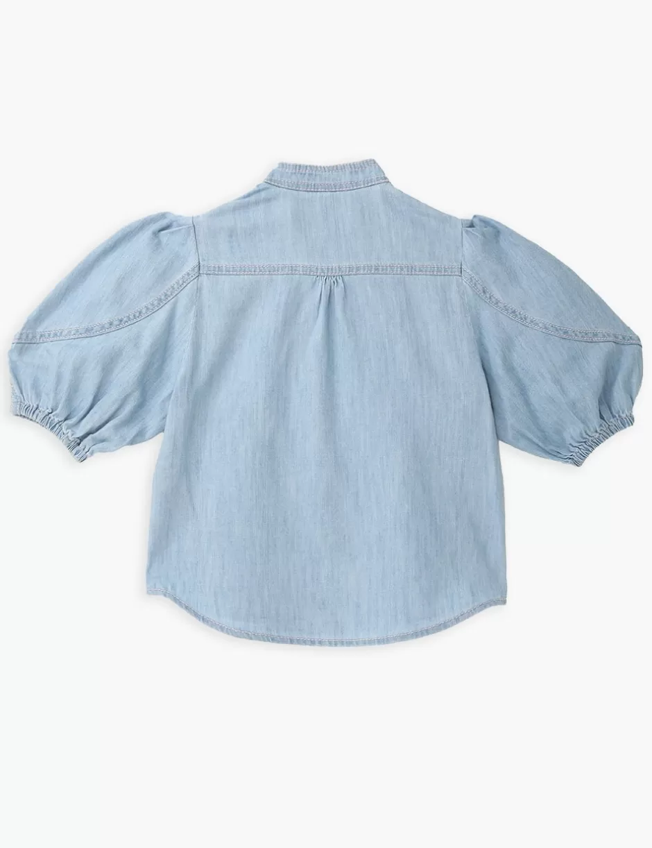 The Waverly Utility Denim Top in Blueberry from our Summer Swim 2024 Collection. A denim button up top featuring panelling and an elasticated sleeve hem.