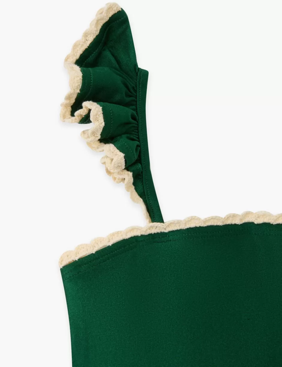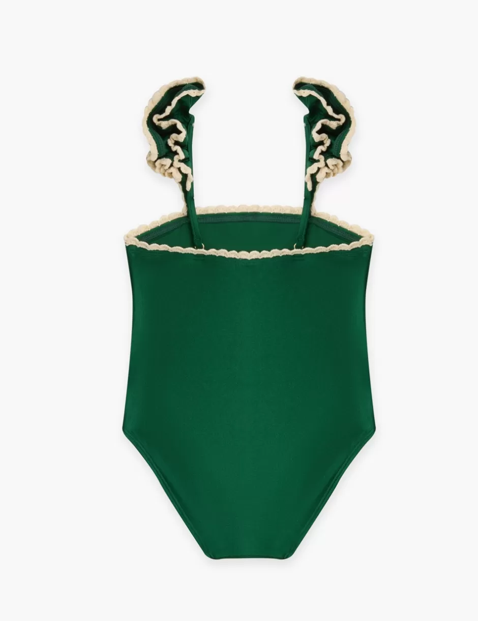 The Wylie Trim Frill 1PC in Emerald from our Resort Swim 2025 Kids Collection. A kids lycra one piece featuring frills o…