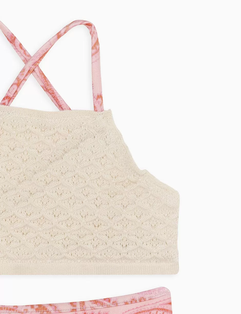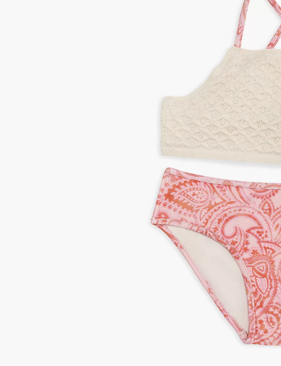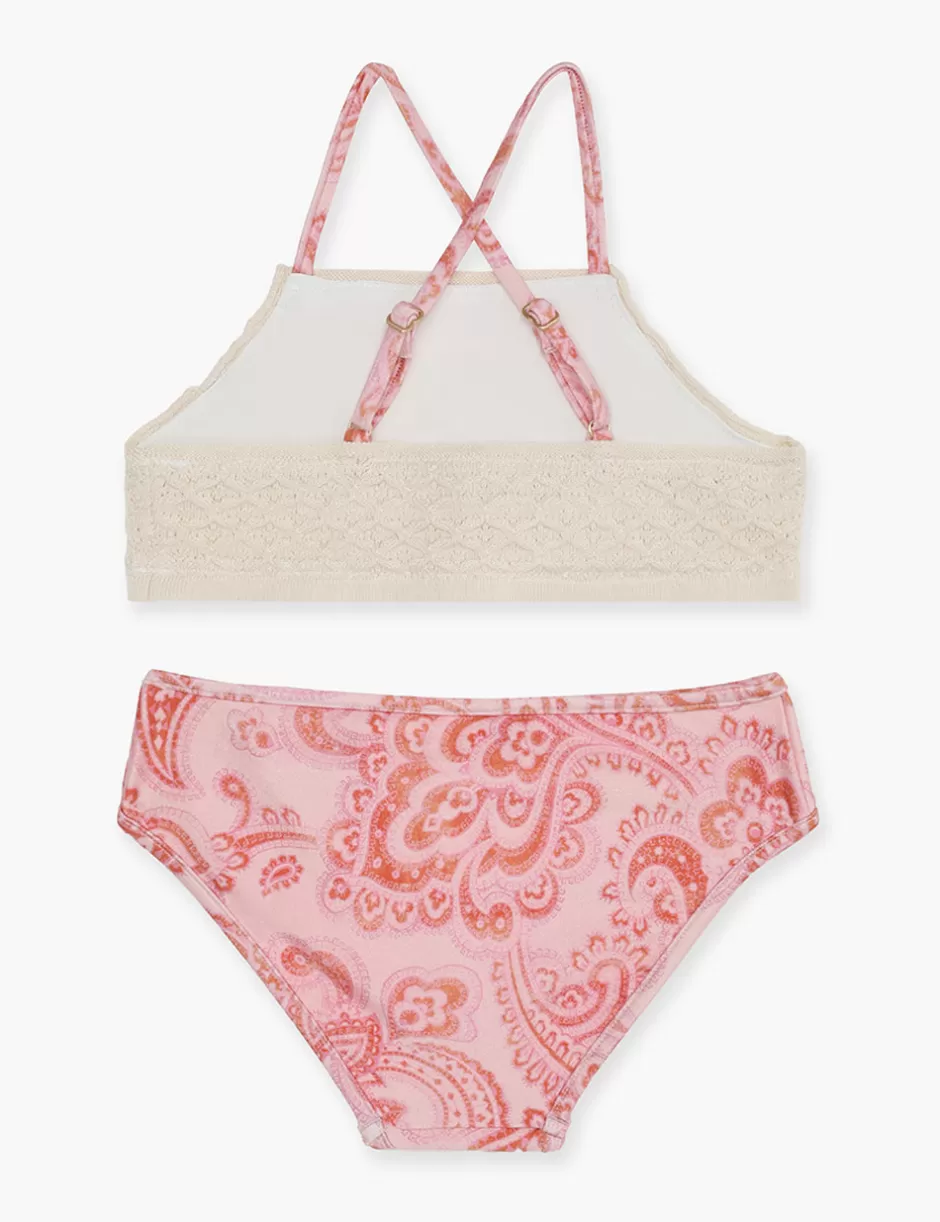 The Ottie Crochet Bikini in Pink Paisley from our Summer Swim 2024 Collection. A kids bikini set featuring a crochet bra and a lycra pant.