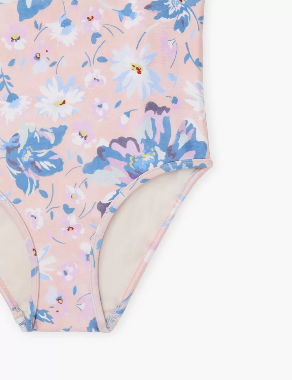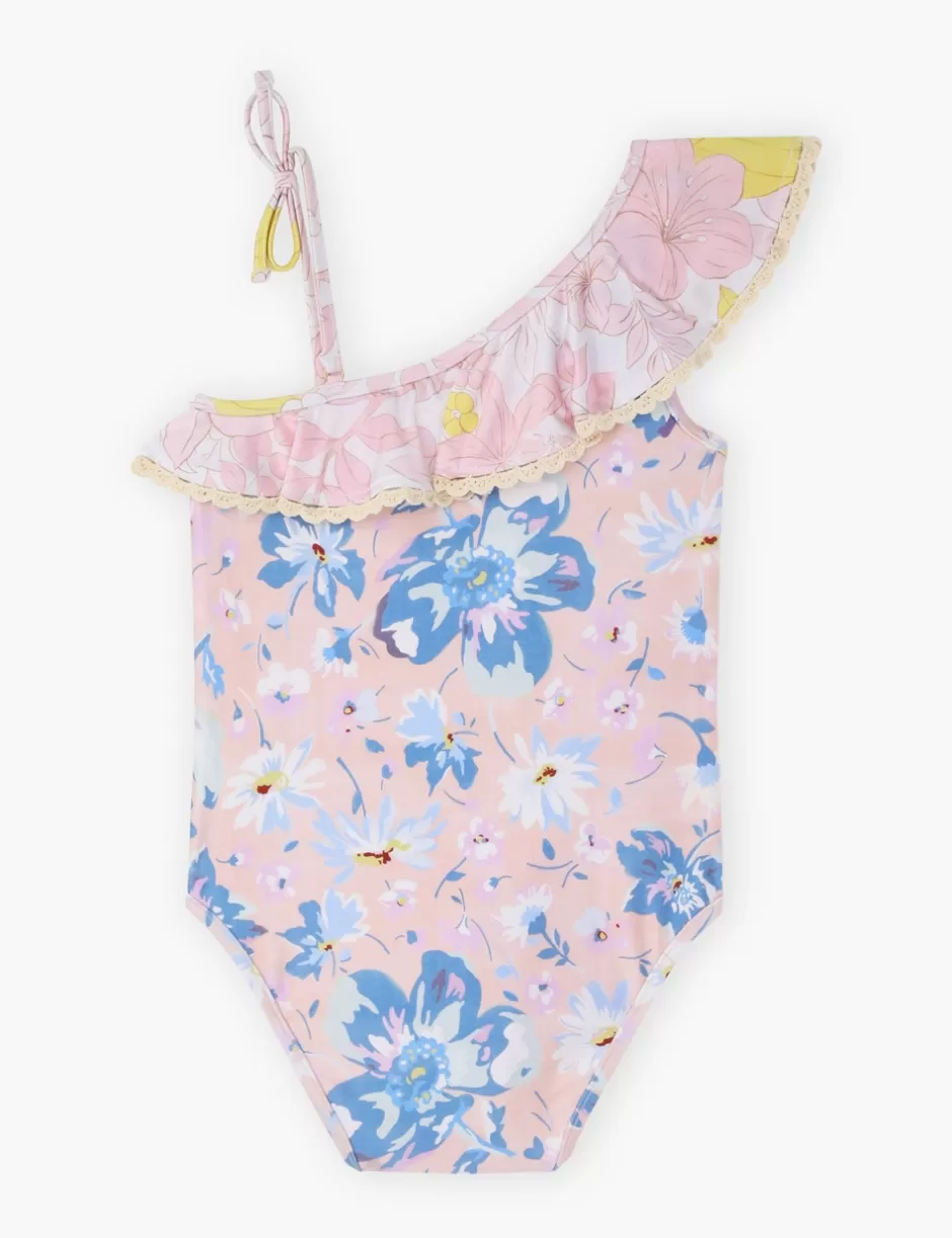 The Pop Trim Frill 1PC in Pink/Blue Floral from our Summer Swim 2024 Collection. A shiny lycra kids one piece featuring an asymmetric frilled shoulder.