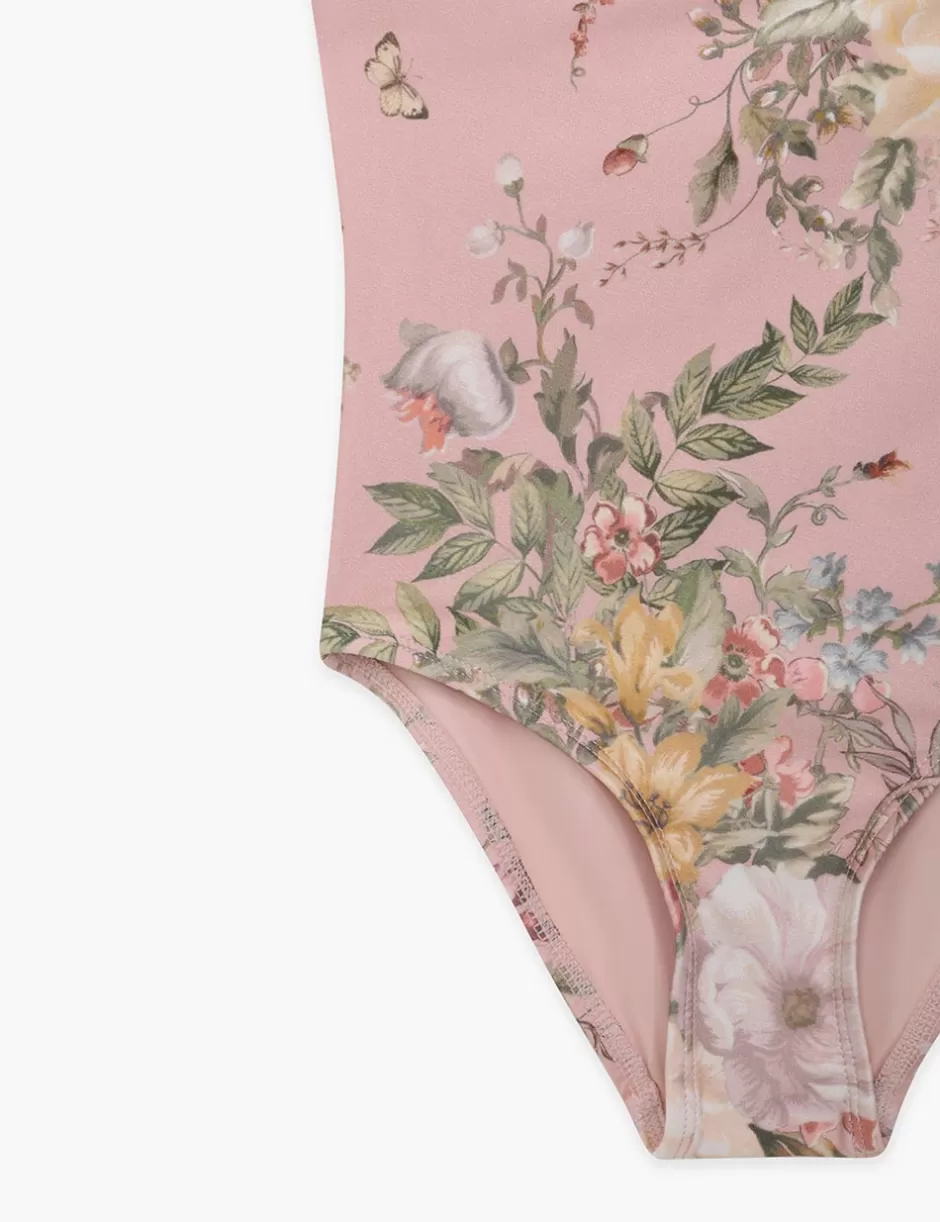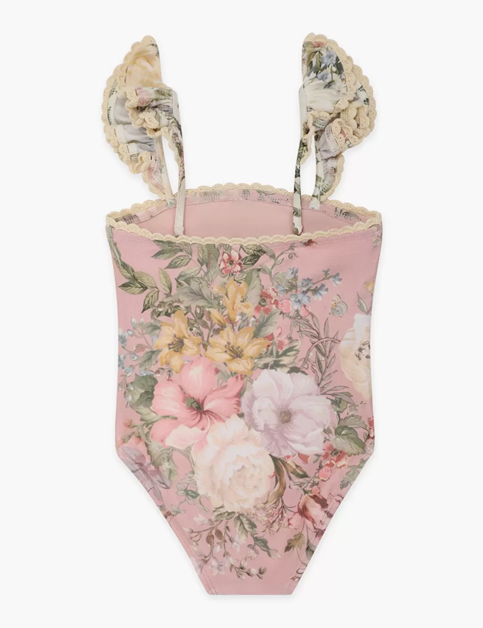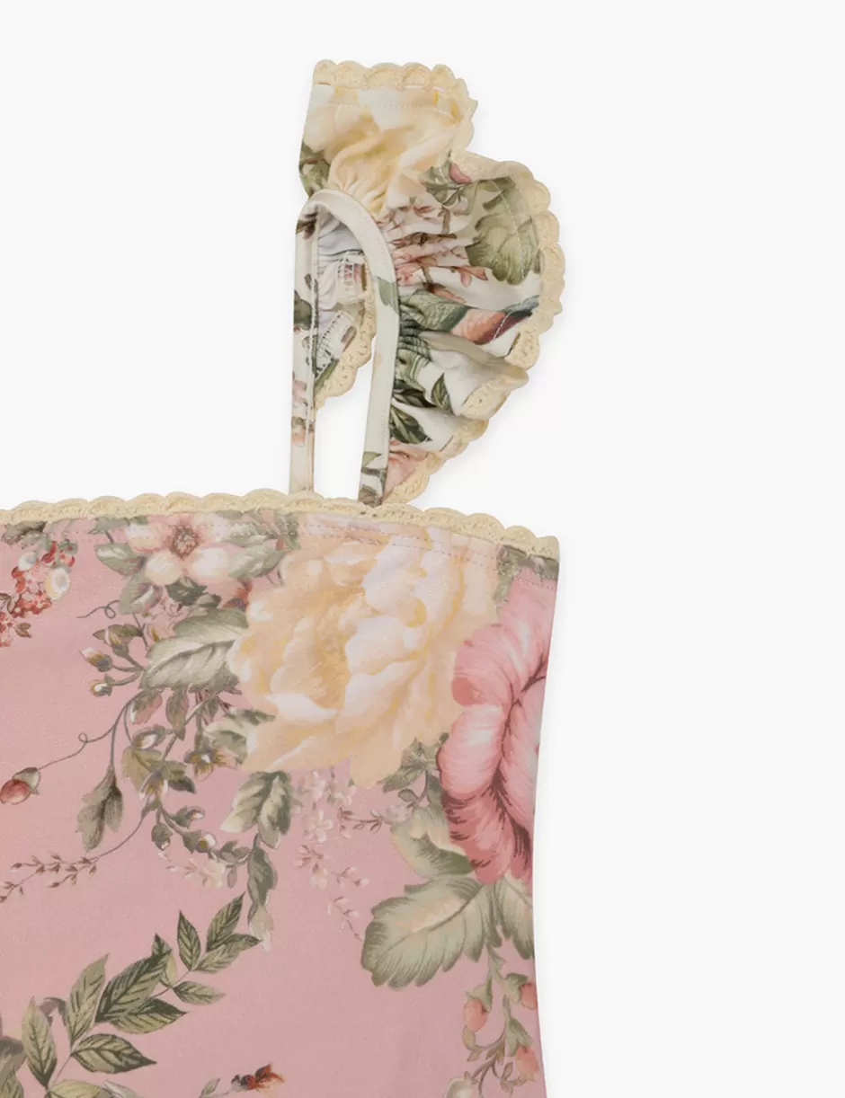 The Waverly Trim Bandeau 1PC in Pink Floral from our Summer Swim 2024 Collection. A kids lycra one piece featuring frills on the straps.