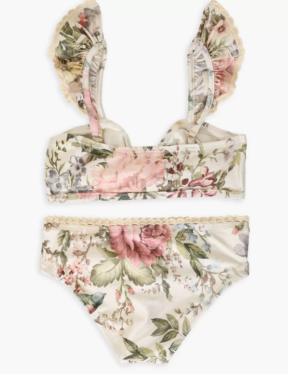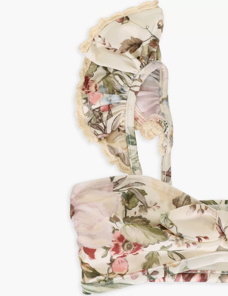 The Waverly Trim Frill Bikini in Cream Floral from our Summer Swim 2024 Collection. A lycra kids bikini set featuring frills and crochet edging throughout.