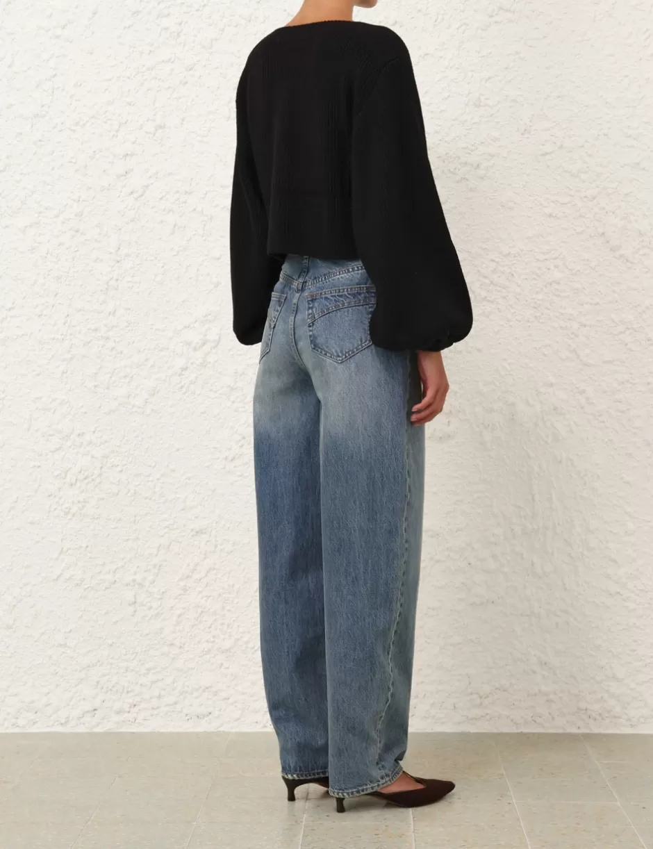 The Illustration Billow Sweater in Black from our Fall 2024 Collection, In Illustration. A wool ribbed sweater featuring a boat neckline and long blouson sleeves with elasticated cuffs.
