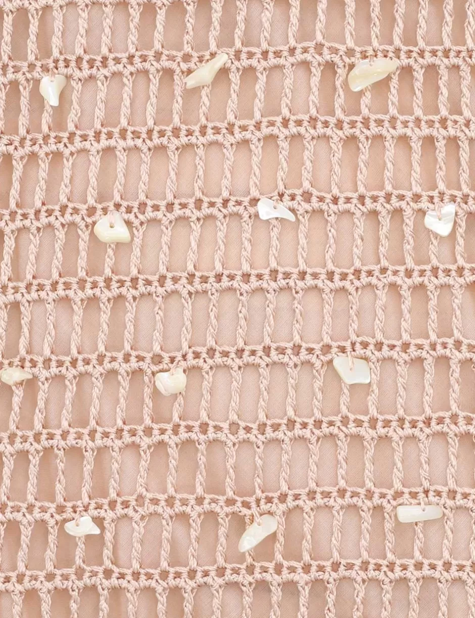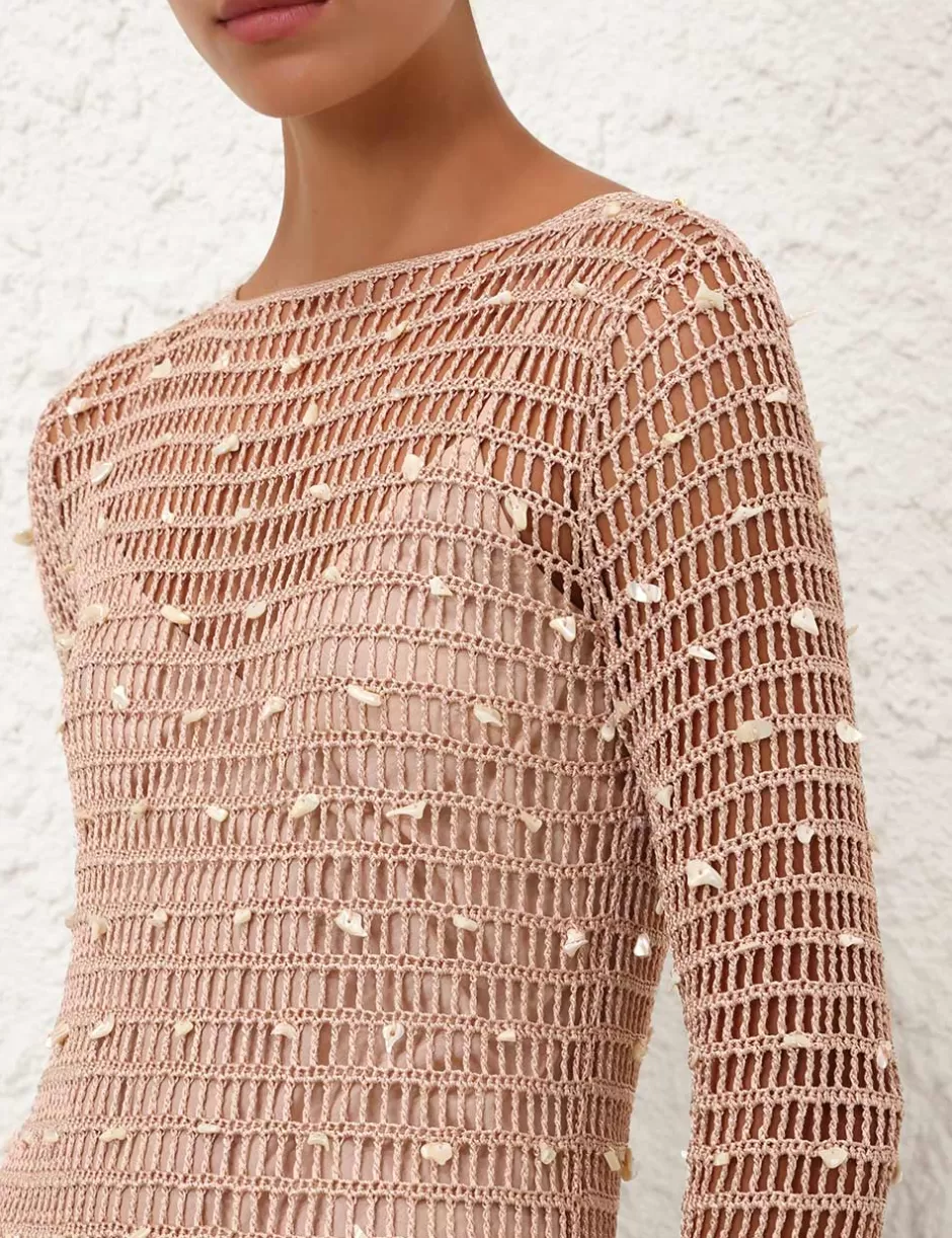 The Wylie Shell Crochet Midi in Taupe from our Resort Swim 2025 Collection. A crochet midi dress featuring long sleeves, boat neck and shell detailing throughout.