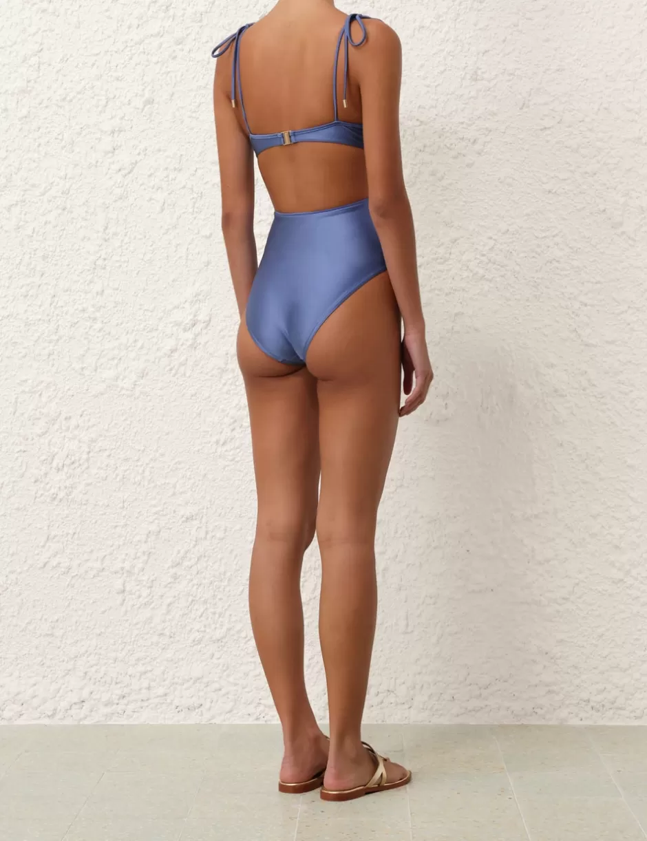 The Golden Gathered Scoop 1PC in Dusty Blue from our Summer Swim 2024 Collection. A shiny lycra one piece featuring a gathered bodice, scooped neckline and self tie shoulder straps with toggle ends.