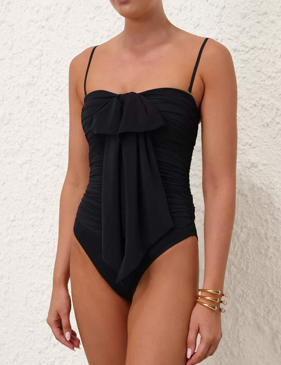 The Halliday Drape Bow 1PC in Noir from our Summer Swim 2024 Collection. A lycra one piece featuring a draped bodice and a bow detail.