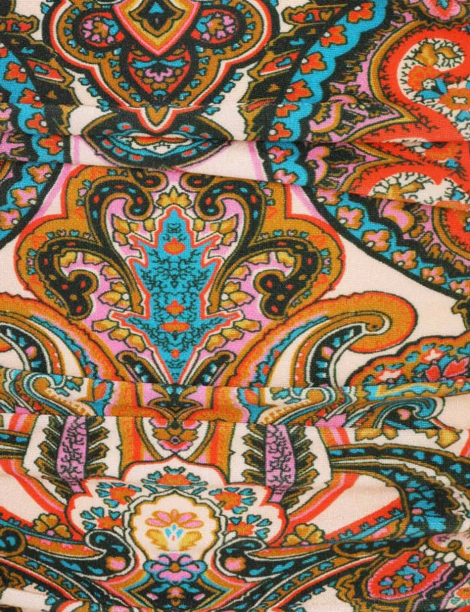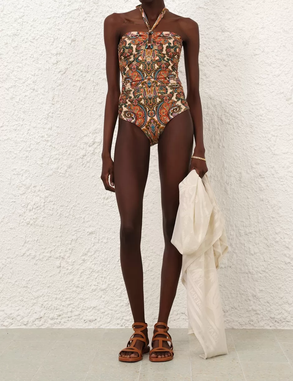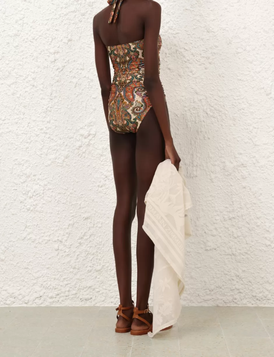 The Ottie Wide Link 1PC in Multi Paisley from our Summer Swim 2024 Collection. A halter neck one piece with ruched sides and wide link detail at centre bust.