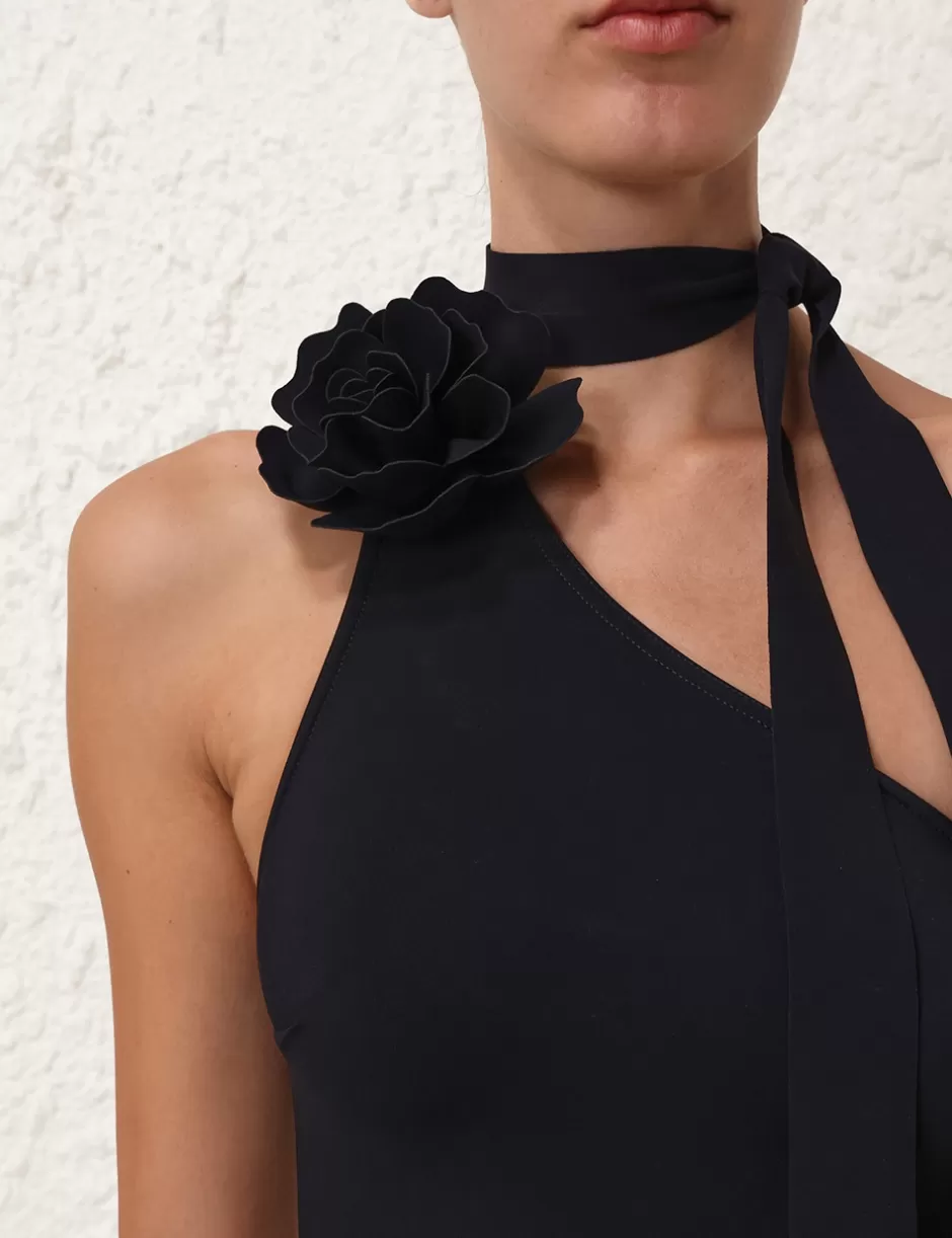 The Waverly One Shoulder 1PC in Noir from our Summer Swim 2024 Collection. A lycra one piece featuring a self bonded tie at the side neck with an attached flower motif.