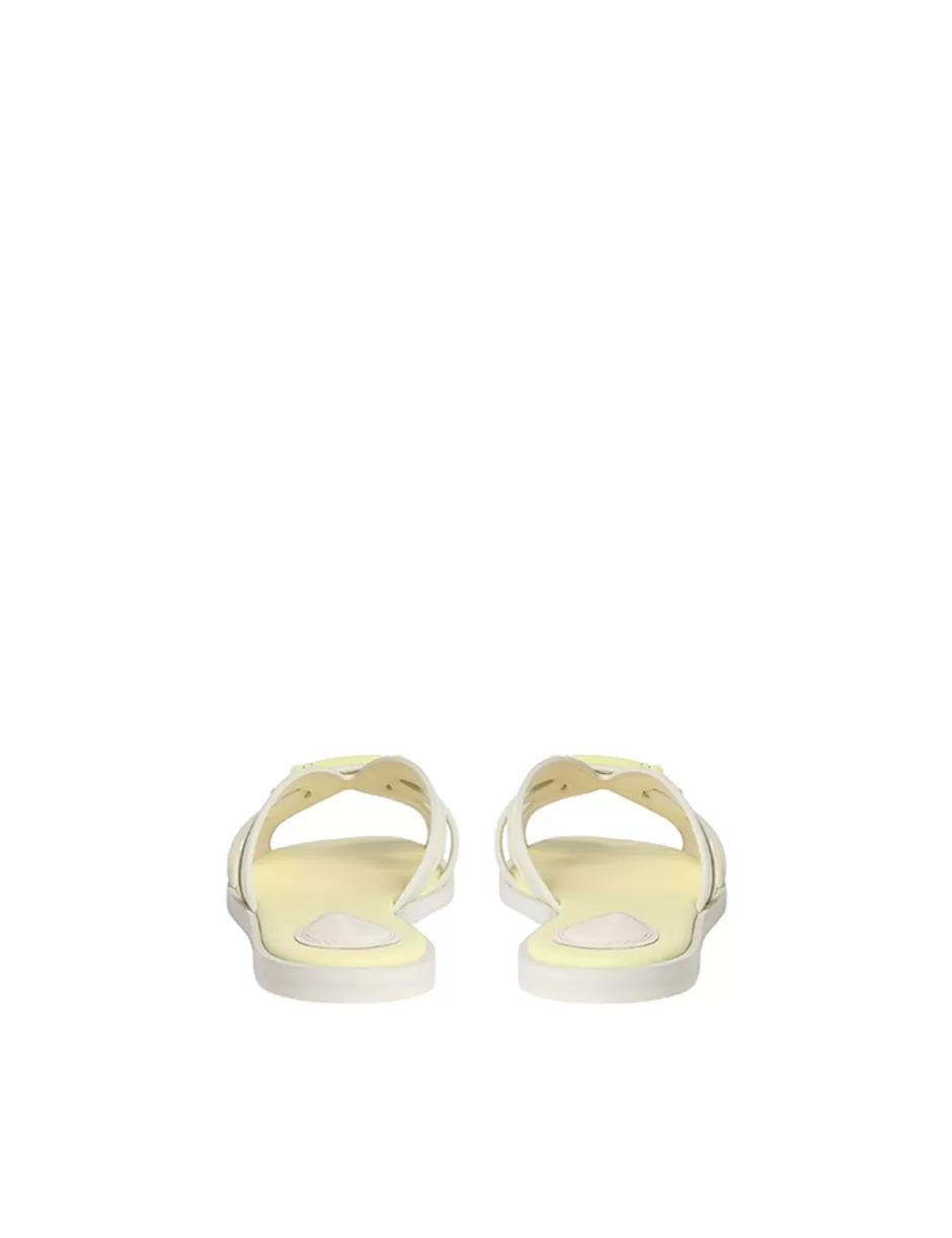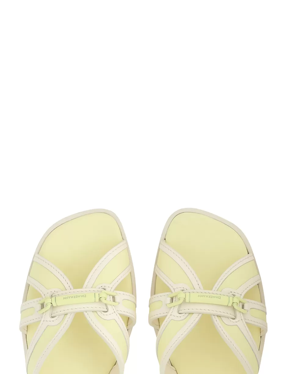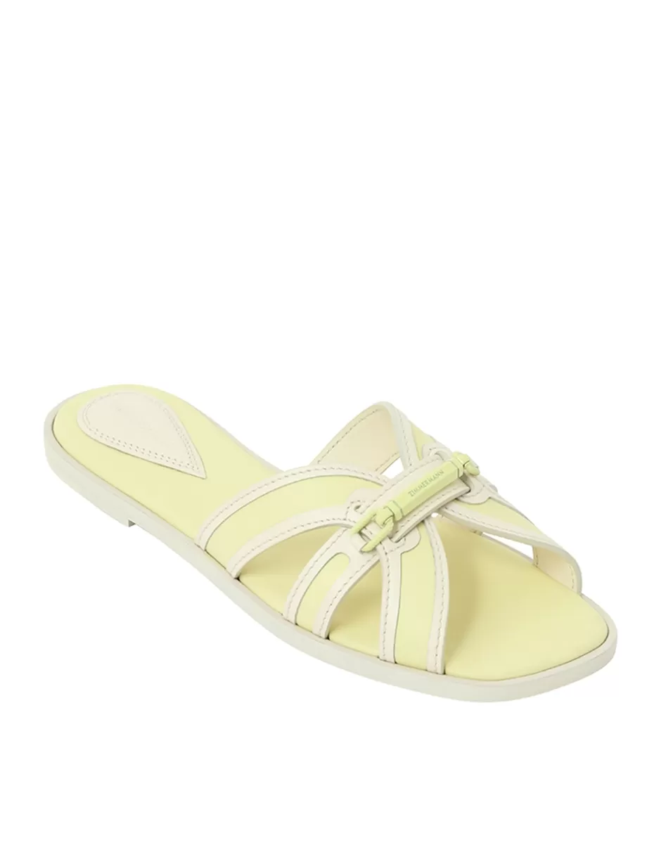 The Zimmermann Prisma Slide in Lemondrop from our Spring 2024 Collection, Natura. A leather slide sandal featuring contrast raffia throughout and ZIMMERMANN branded hardware.