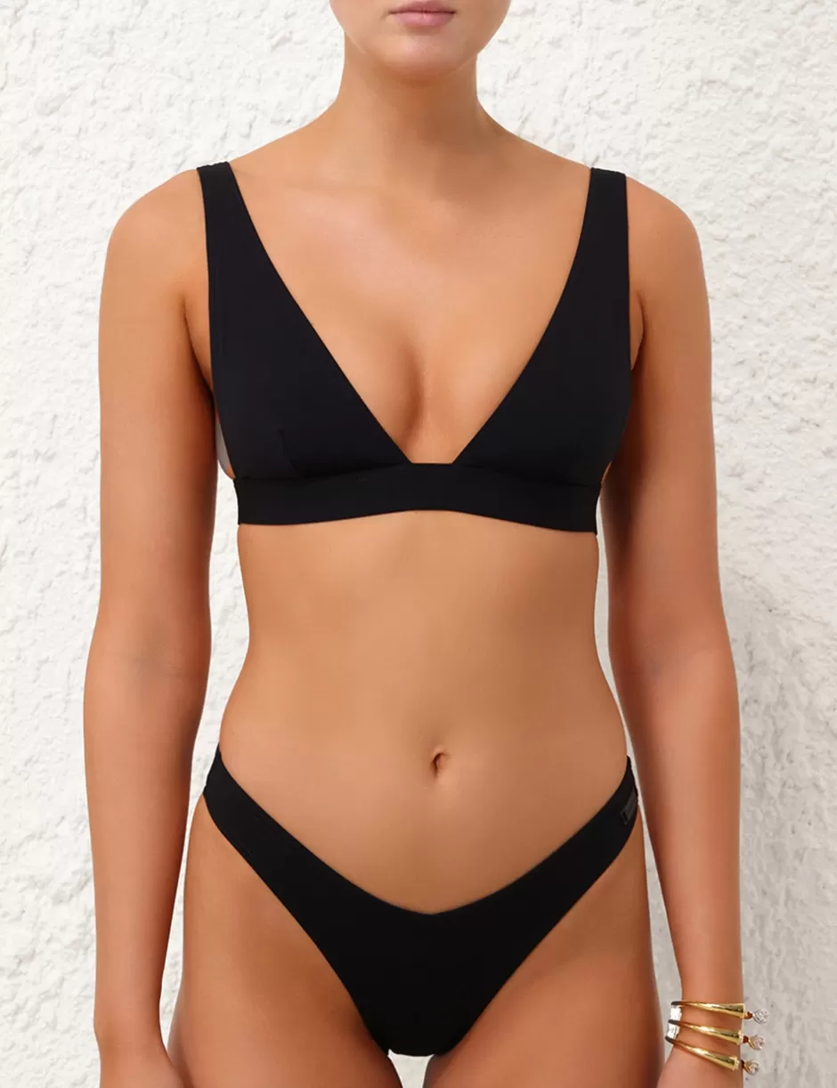 The Separates Wide Tri Bra in Black from our Summer Swim 2024 Collection. A bikini top constructed from form-fitting Italian lycra featuring a wide under bust band and straps.