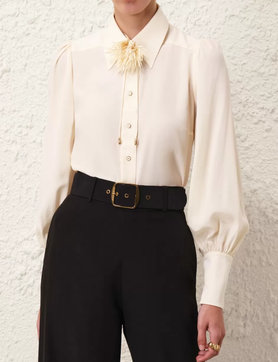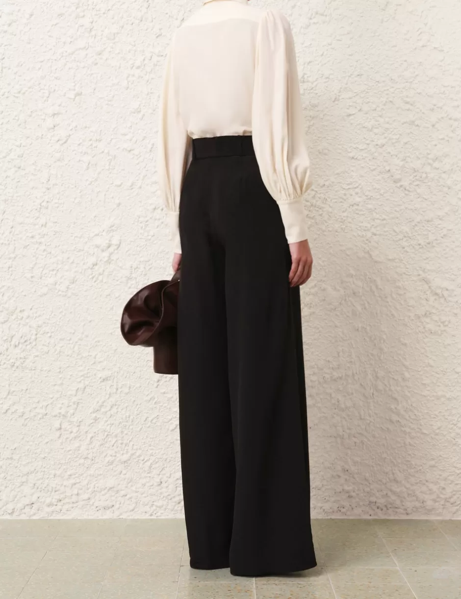 The Belted Wide Leg Pant in Black from our Fall 2024 Collection, In Illustration. A high waisted, wide leg pant featuring a contrast side seam and a removable buckle belt.