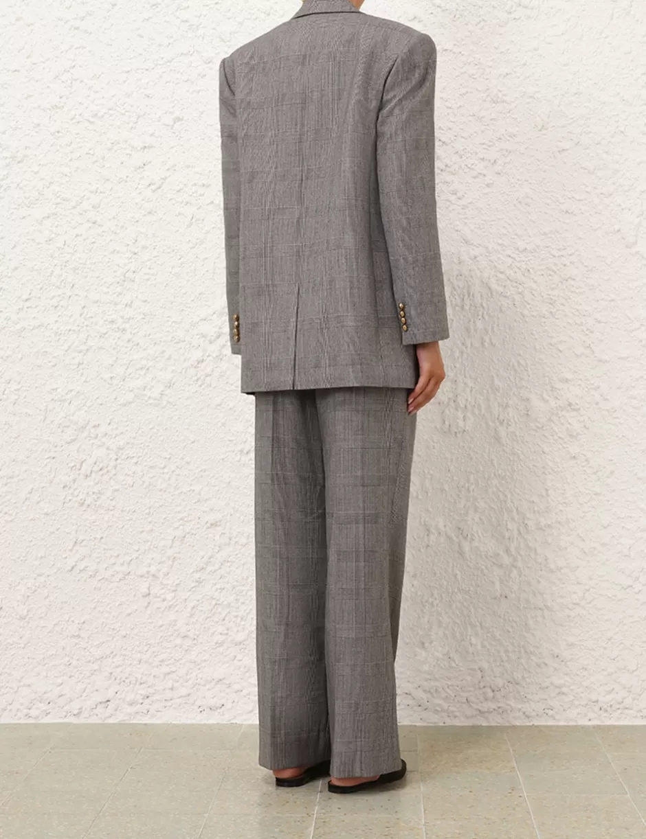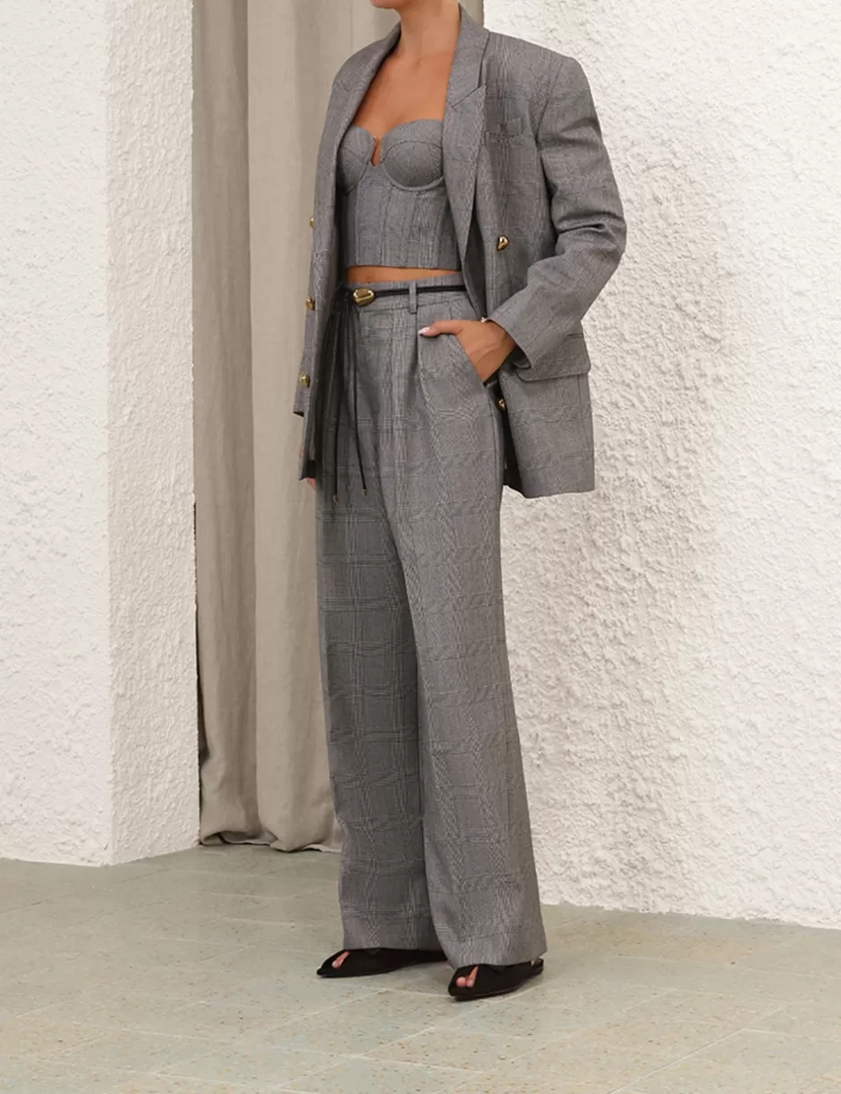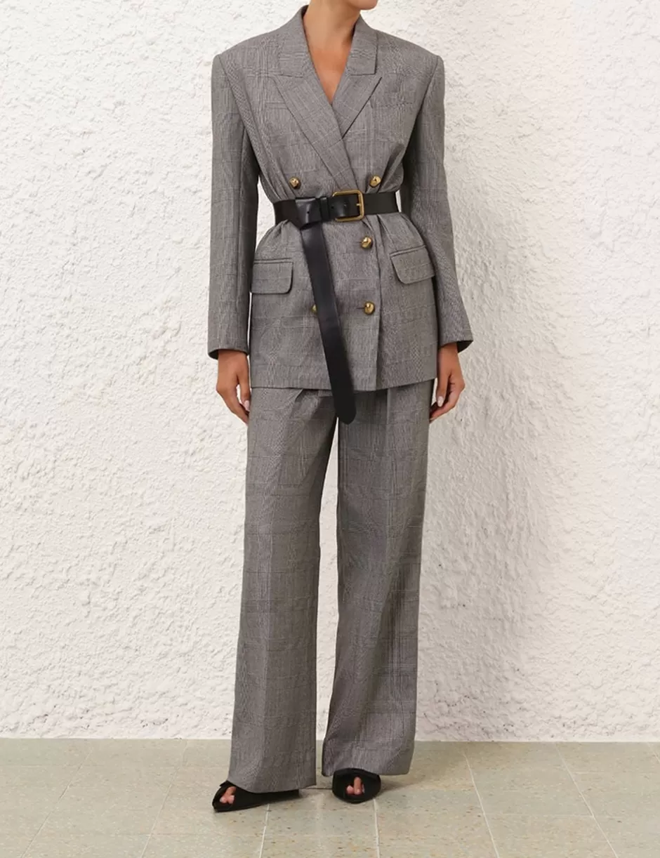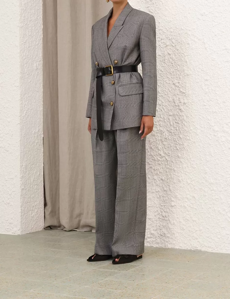 The Crush Tuck Wide Leg Pant in Check from our Resort 2025 Collection, Crush. A silk wool blend wide leg, mid rise pant featuring side seam pockets, a removable pebble belt and a front fly closure.