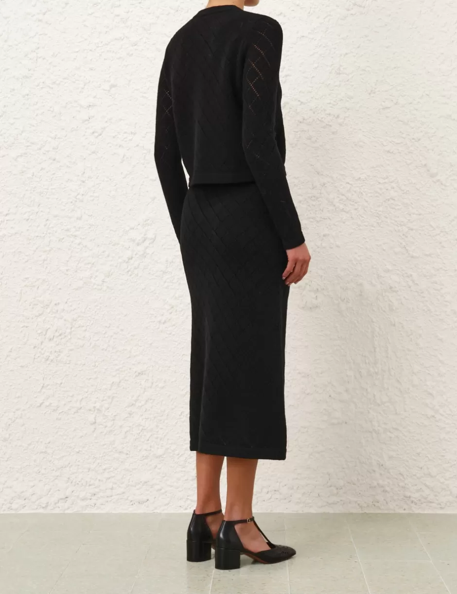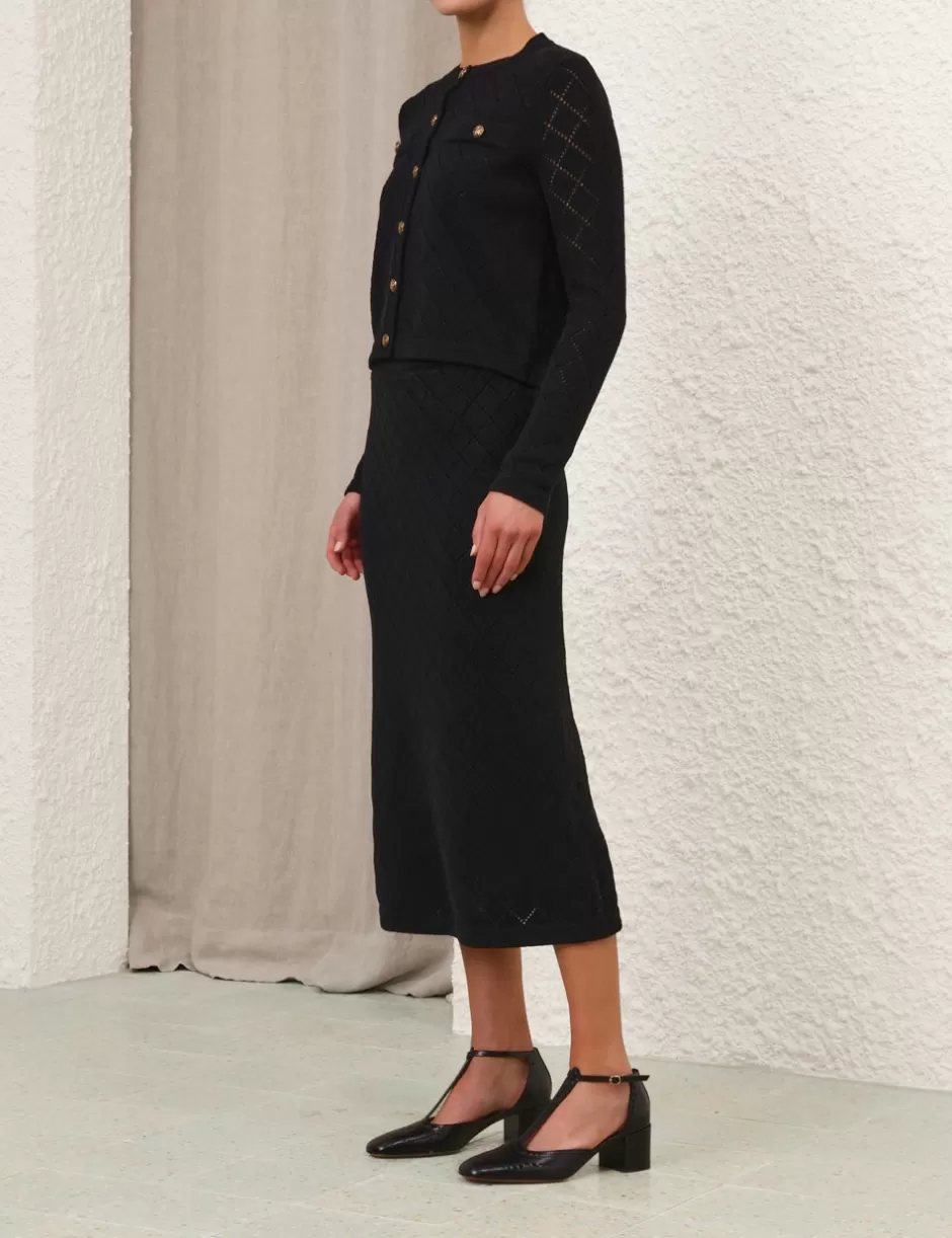 The Illustration Pointelle Skirt in Black from our Fall 2024 Collection, In Illustration. A wool knit midi skirt featuring an elasticated waist and a ribbed hem.