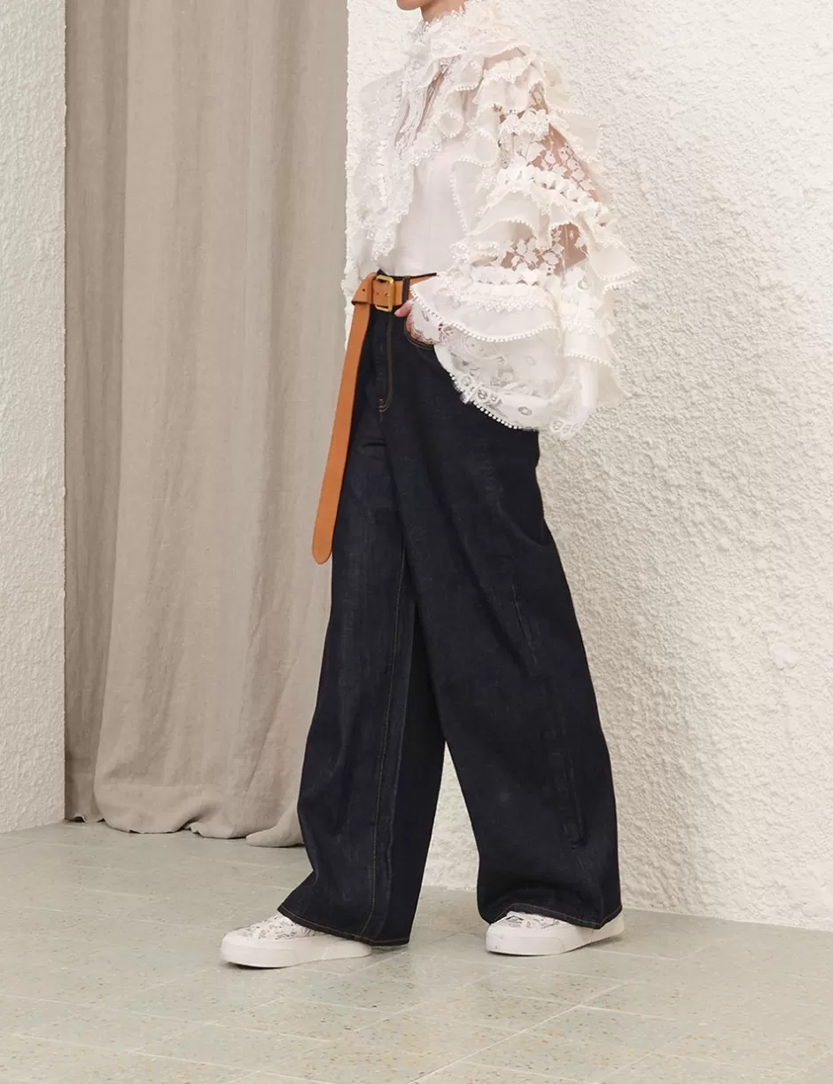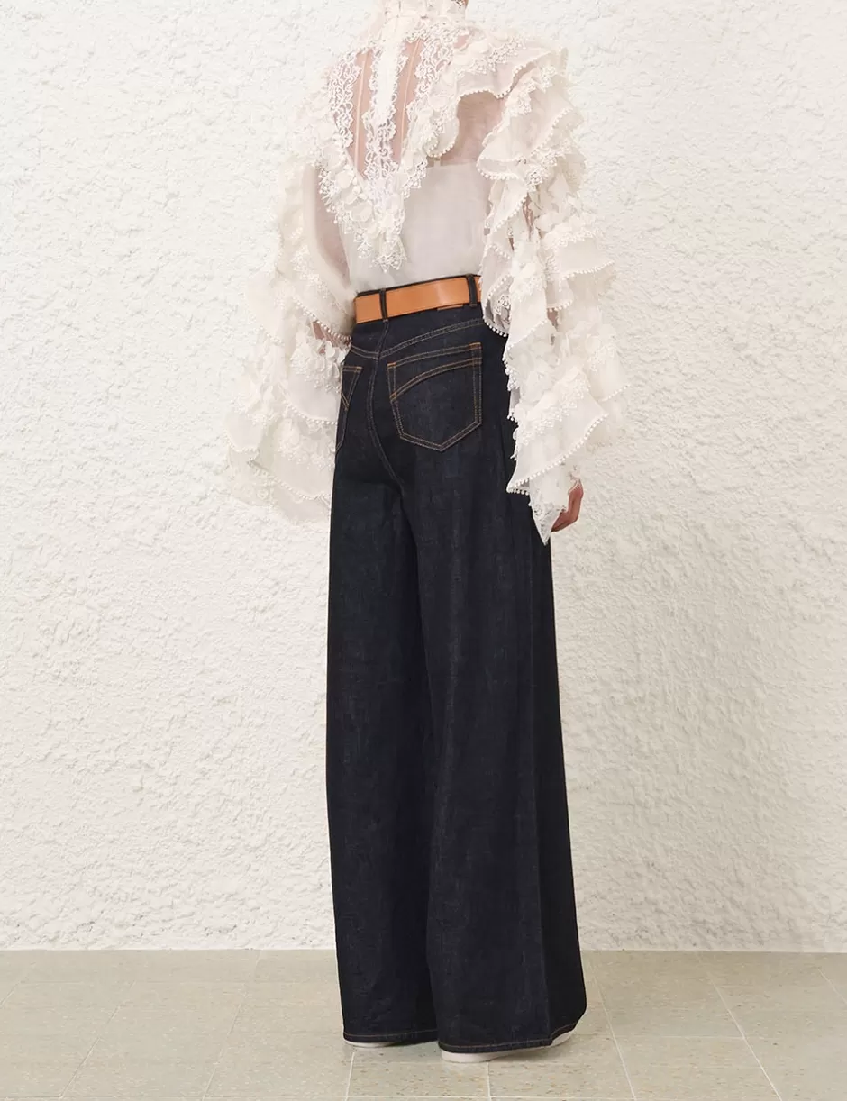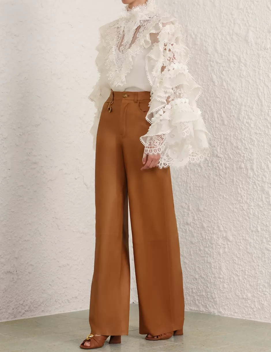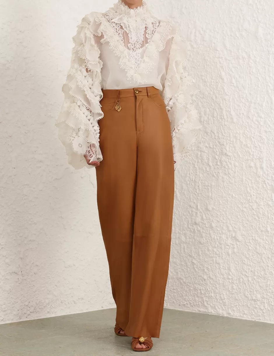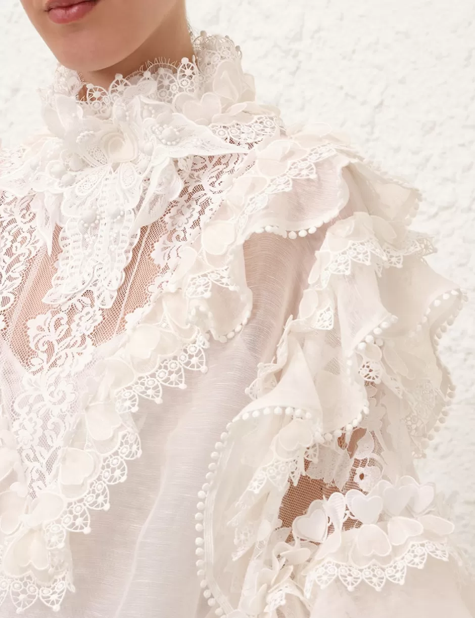 The Crush Heart Trim Blouse in Ivory from our Resort 2025 Collection, Crush. A silk linen organza long sleeve blouse featuring a stand collar with butterfly trims around the neckline, a centre back zip closure and ruffle detailing throughout.