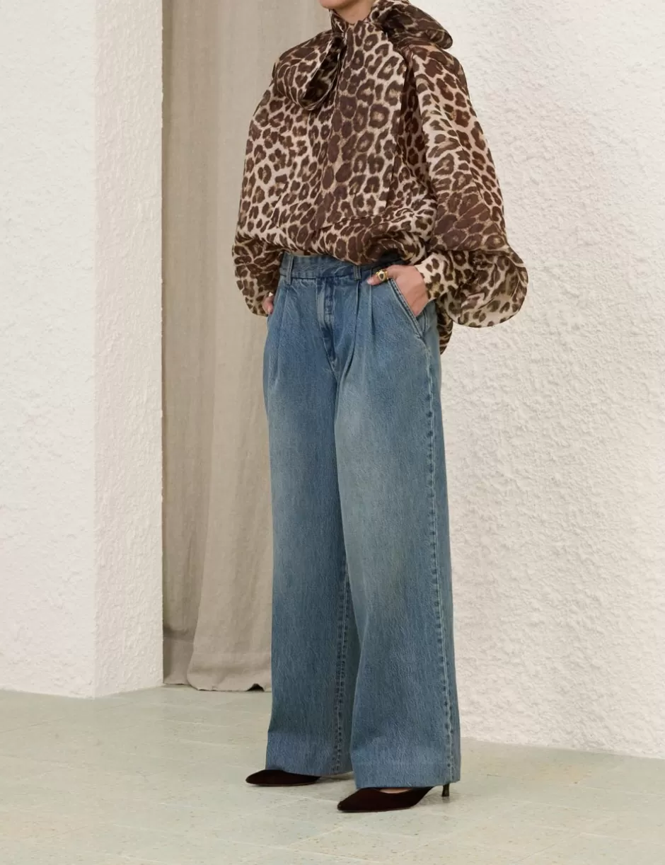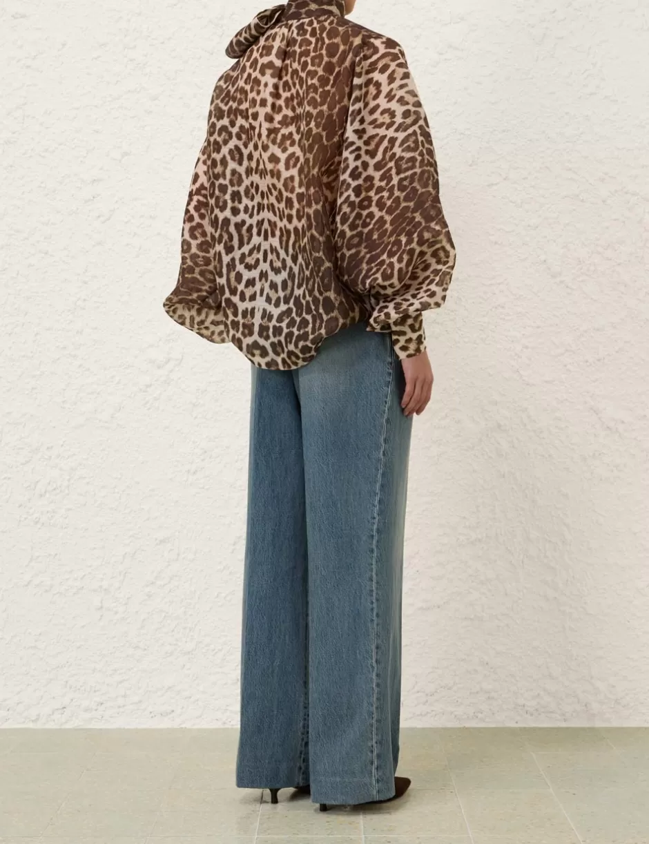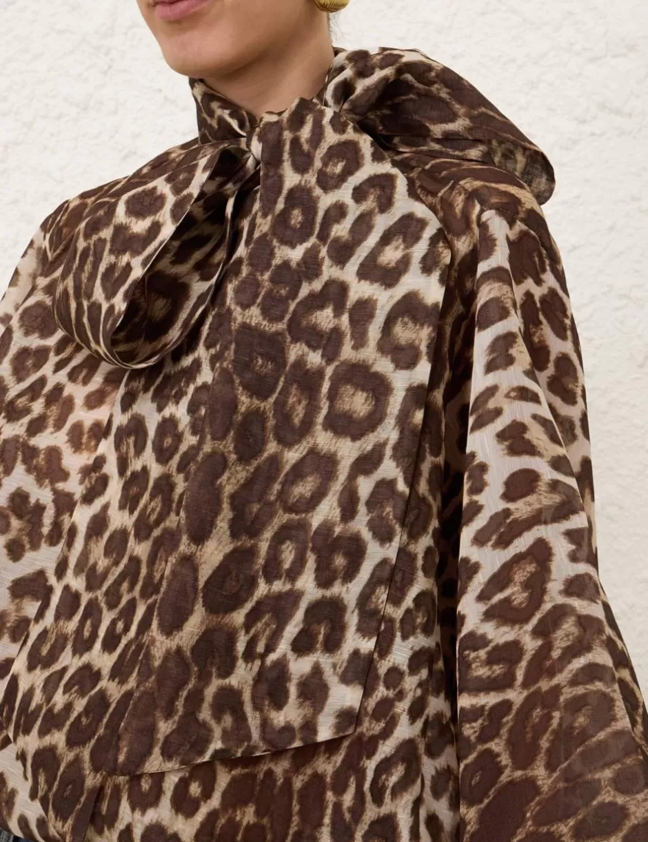 The Illustration Billow Blouse in Chocolate Leopard from our Fall 2024 Collection, In Illustration. A silk linen blouse featuring an adjustable self tie collar and exaggerated blouson sleeves.